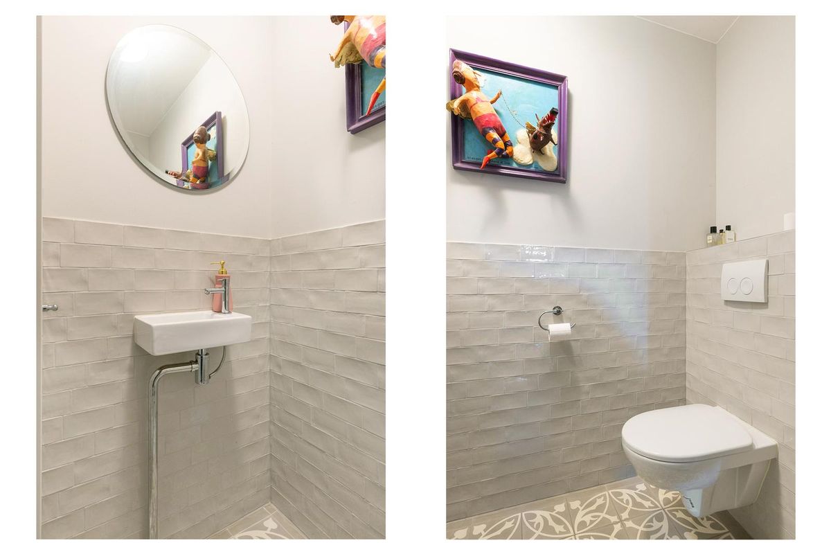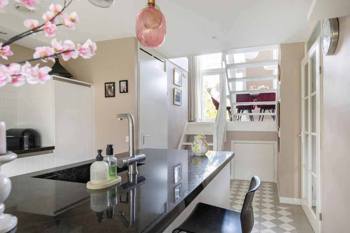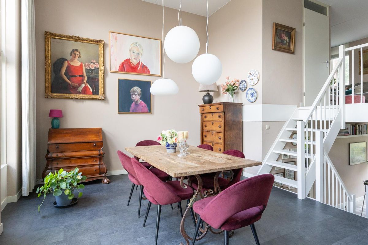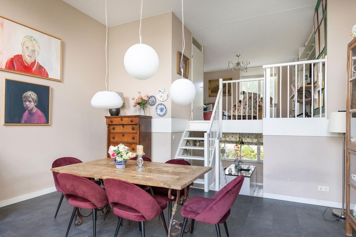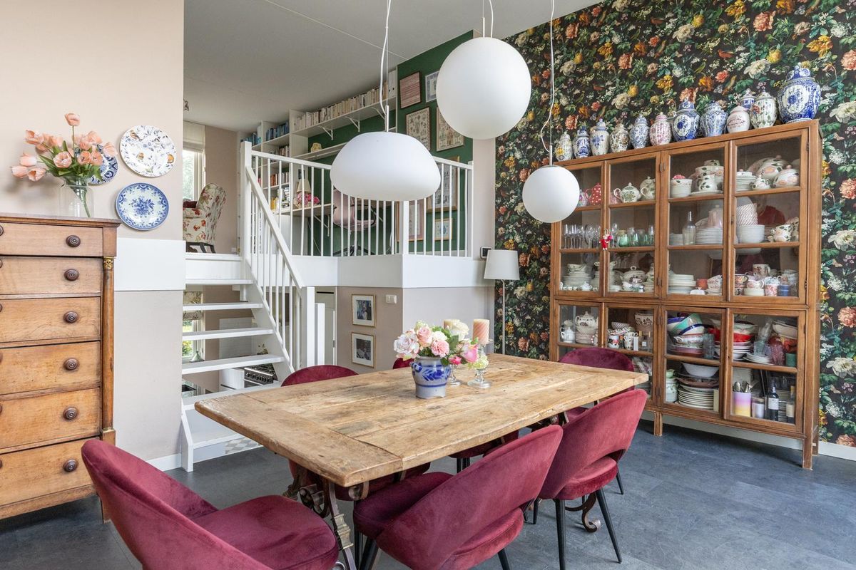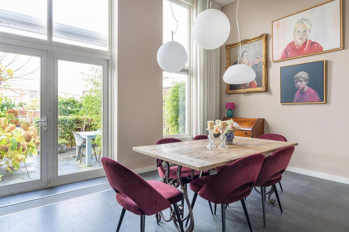 Een korte trap vanuit de keuken brengt je in de verhoogde eetkamer. Door het hoge plafond van bijna 4 meter, de grote raampartijen en de openslaande deuren naar het terras voelt deze verdieping heerlijk licht en ruim. Dit is dé plek voor lange etentjes of gezellige avonden met vrienden.