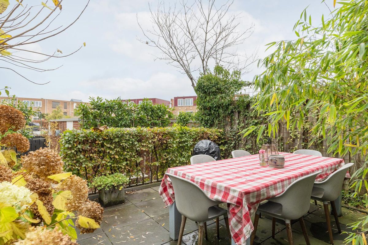 Vanuit de eetkamer stap je het verhoogde terras op. De ideale plek om buiten te eten of te relaxen in de middagzon. De split level opzet loopt ook door in de tuin. Via een trap daal je af naar het lagere deel van de tuin, waar je meer privacy en groen vindt. Achterin staat de stenen garage met elektra, bereikbaar via een praktische achterom. De tuin ligt op het noordwesten, dus zonliefhebbers zitten hier ’s middags en ’s avonds helemaal goed.