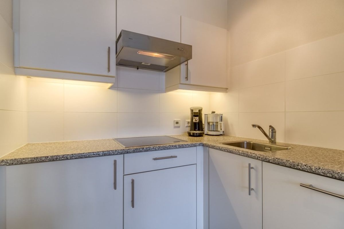 woonkamer heeft een open keuken en een zit- een eethoek (L-kamer). De keuken in hoek-opstelling is voorzien van alle nodige en geïntegreerde inbouwapparatuur zoals 4 pits- inductie kookplaat, afzuigkap, spoelbak, combi-magnetron, vaatwasmachine (vervangen in 2023) en koelkast met vriesvak. Via dubbele opendraaiende deuren komt u op het balkon (4,60 m2) gelegen op het zuidwesten. Wanneer u de deuren volledig openzet betrekt u het balkon optimaal bij de leefruimte. Aangrenzend aan de woonkamer is er één slaapkamer (2,72 x 2.97m) en de badkamer die bestaat uit een douche en wastafelmeubel.