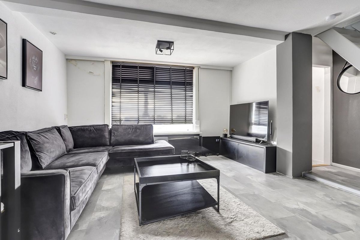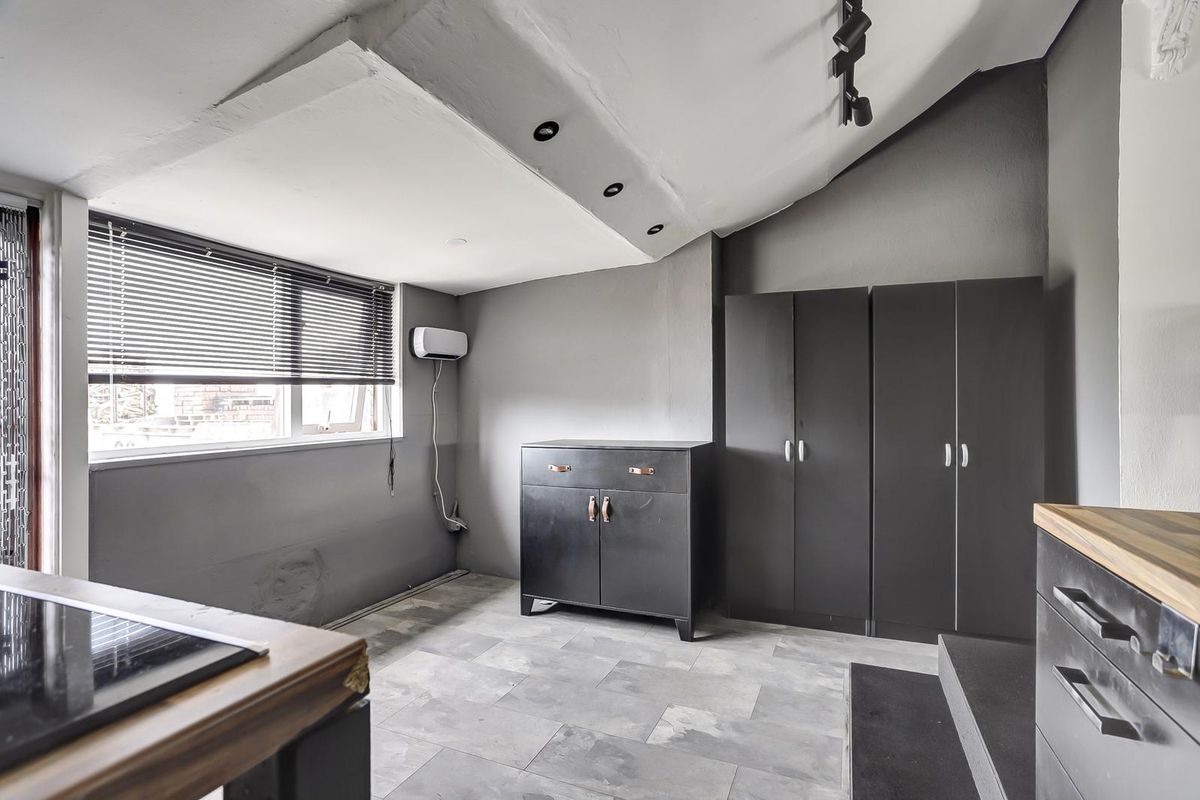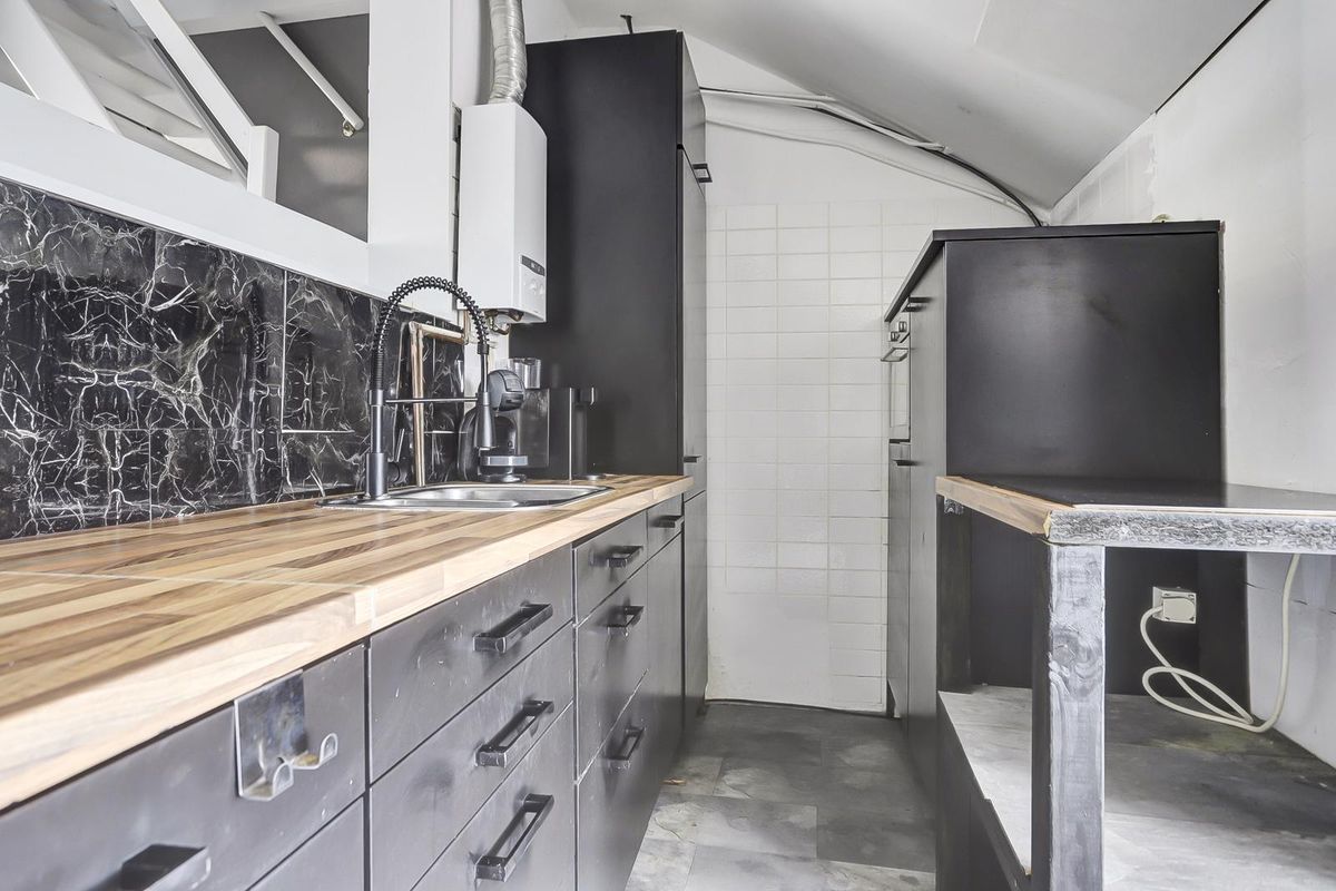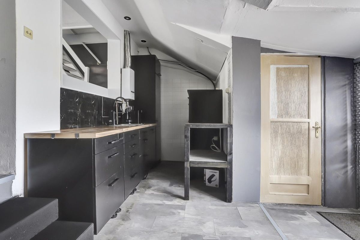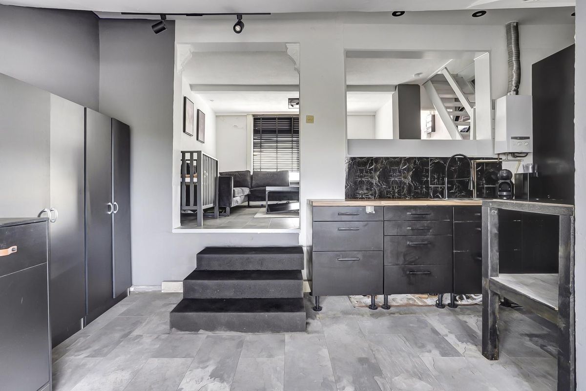 De keuken ligt enkele treden lager en vormt daardoor een speels geheel met de woonkamer. Hier vindt u matzwarte kastfronten, een houtlook werkblad en een achterwand in marmerlook. De diepe spoelbak met zwarte kraan en de open opstelling maken het geheel strak en modern. De cv-installatie bevindt zich aan de zijwand.