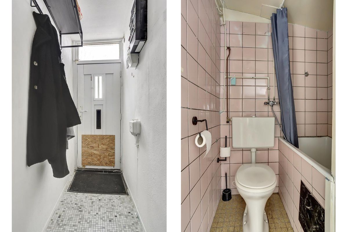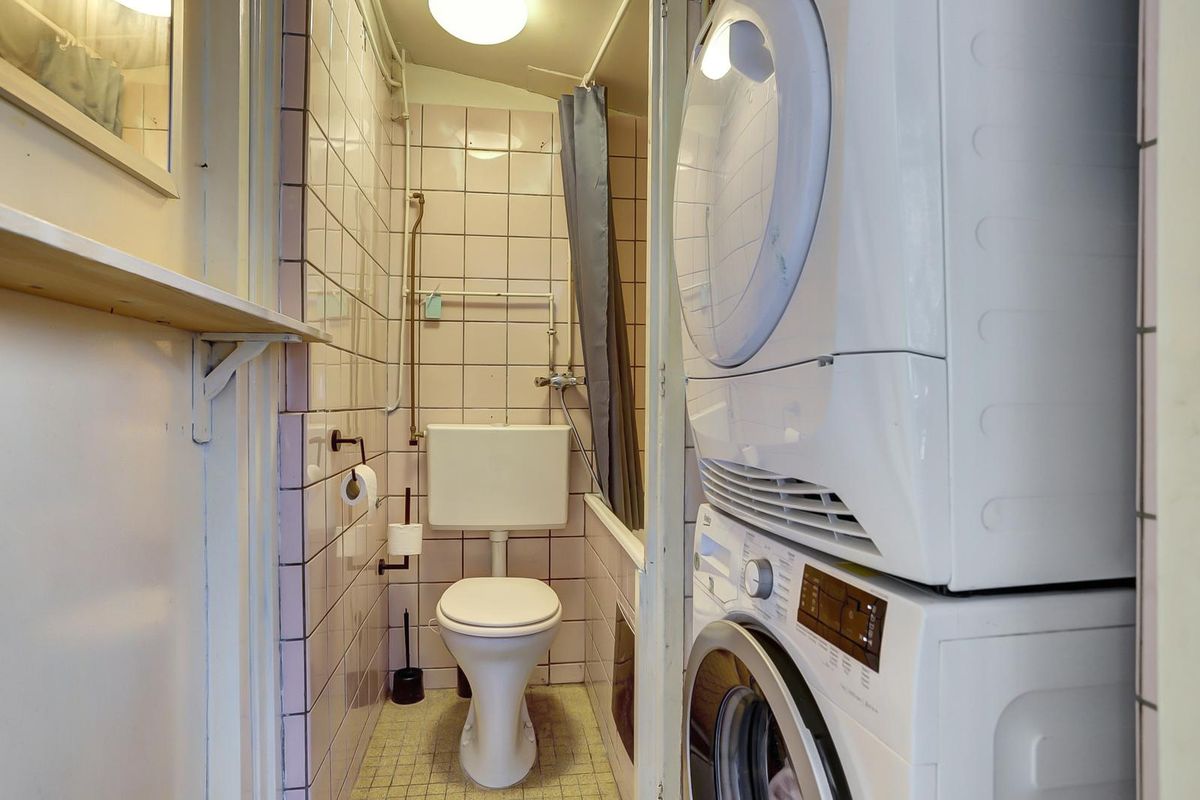 Via de keuken bereikt u de badkamer, die compact maar functioneel is ingedeeld met een toilet, douche (in zitbad) en opstelplaats voor wasmachine en droger. De wanden zijn betegeld met lichtroze vierkante tegels.
