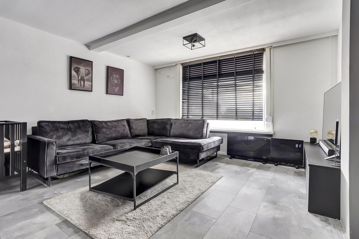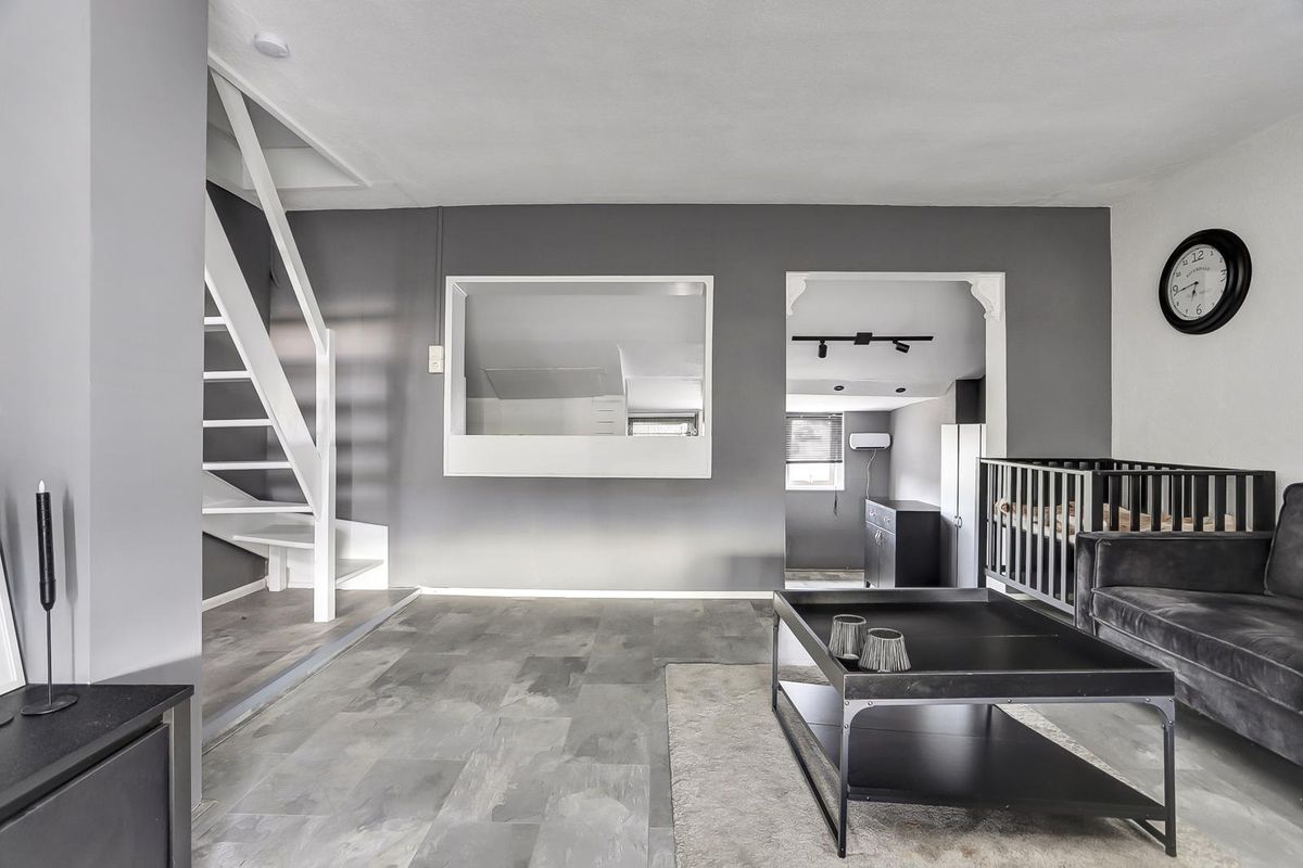U stapt binnen in de lichte woonkamer met een brede raampartij en moderne zwarte jaloezieën. De vloer is afgewerkt met een grijze betonlook laminaat die zorgt voor een stoere, rustige basis. De witte wanden en grijze accenten geven de ruimte een moderne uitstraling, terwijl de zichtbare plafondbalk en de zwarte armaturen zorgen voor een eigentijdse sfeer.