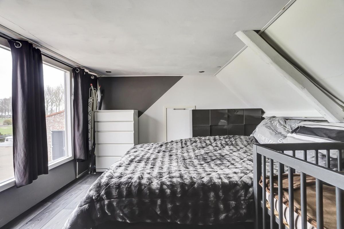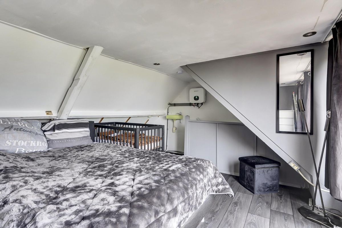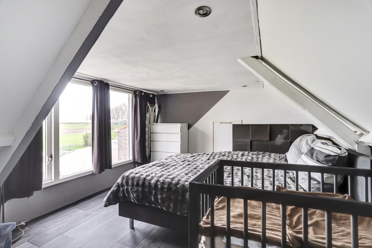 De open witte trap leidt naar de verdieping waar zich een ruime slaapkamer bevindt. Dankzij de brede dakkapel komt hier veel daglicht binnen en oogt de kamer ruim. De afwerking is licht en neutraal, met vaste kastruimte onder de schuine kap. De hoogte bedraagt circa 1,80 meter, zoals aangegeven op de plattegrond. Vanuit deze ruimte geniet u van het polderlandschap!