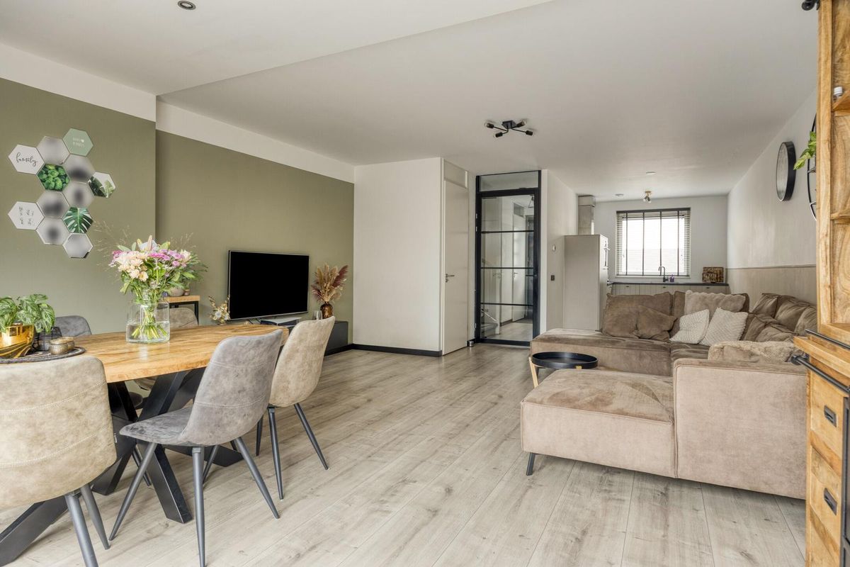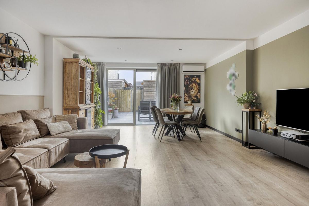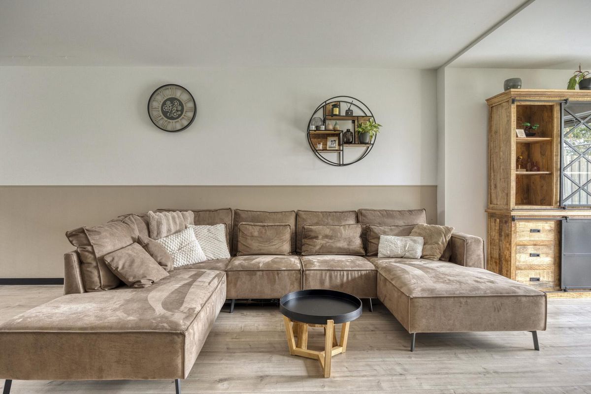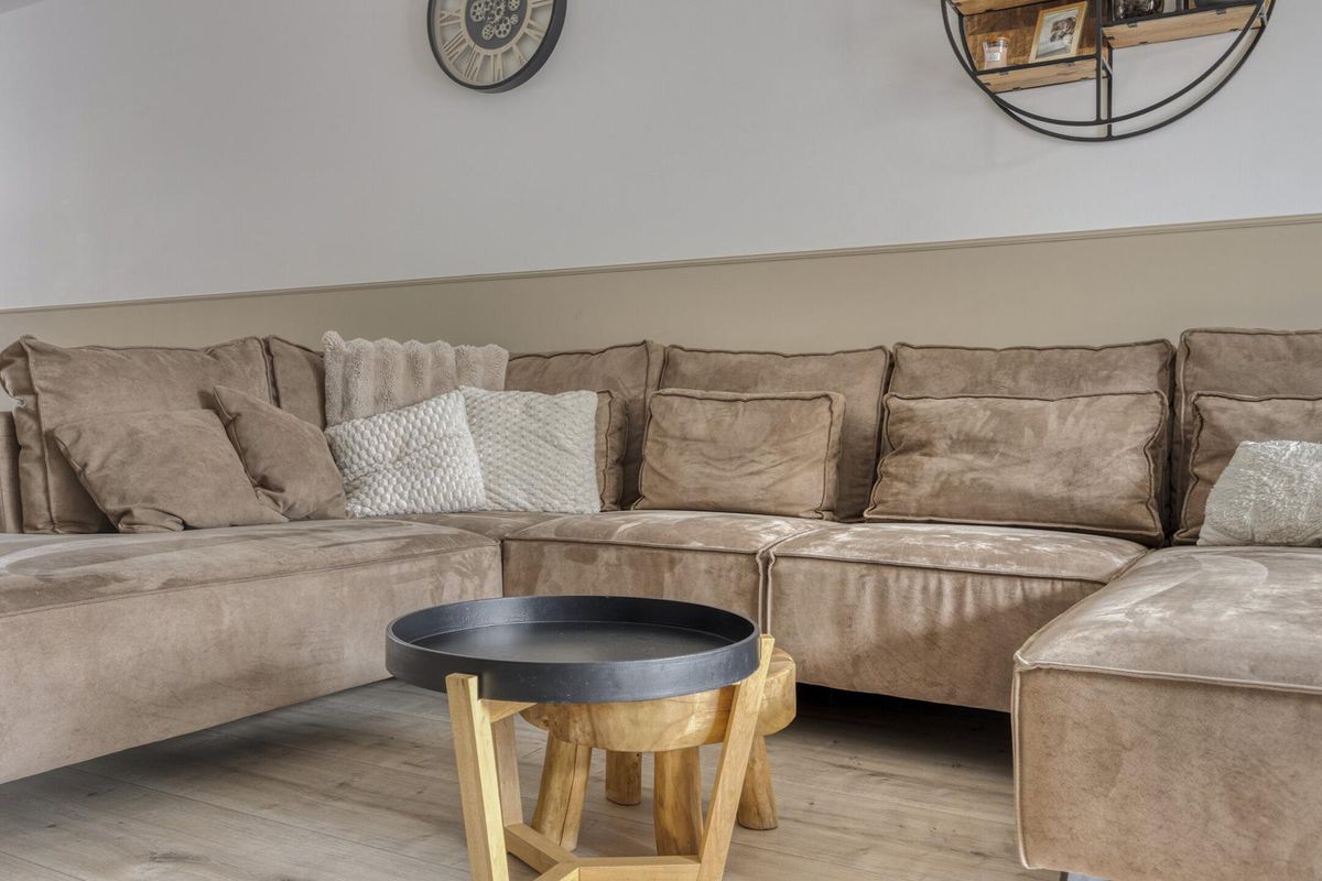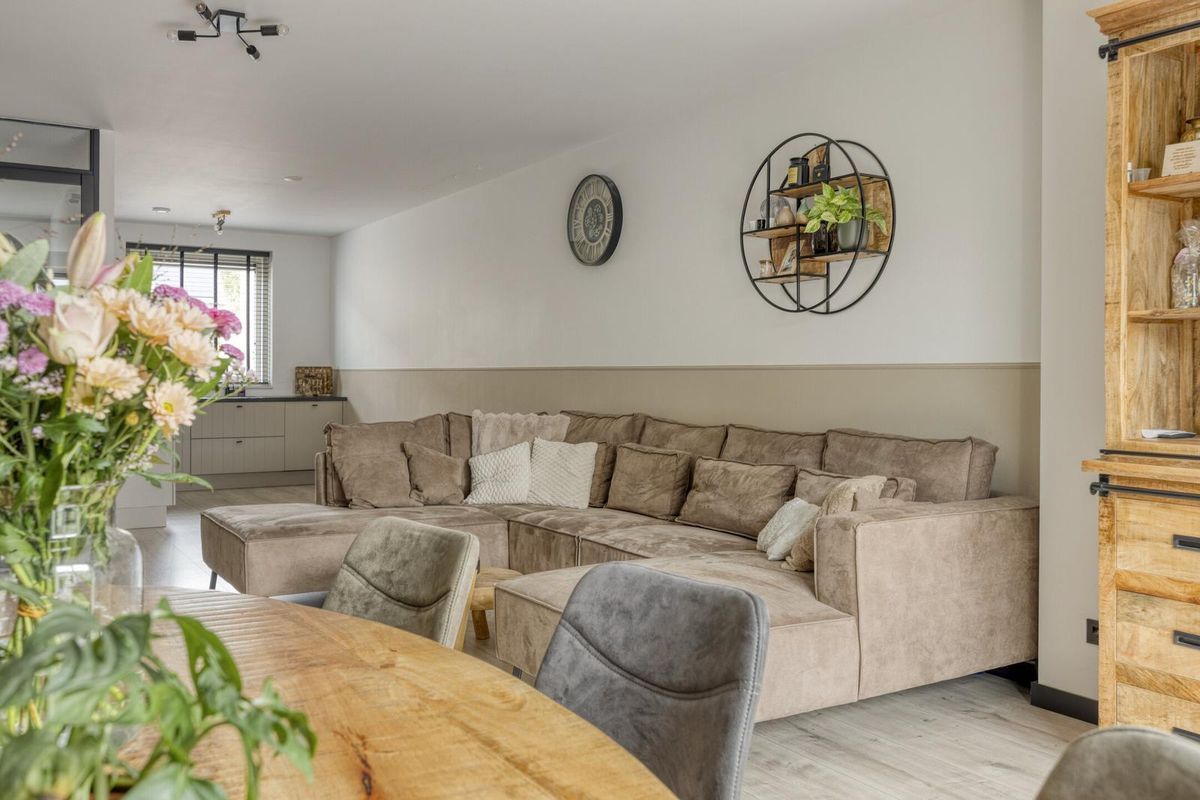 Ruime L-vormige living (36m²) met vloerverwarming met een strakke wandafwerking en brede stroken laminaatvloer.