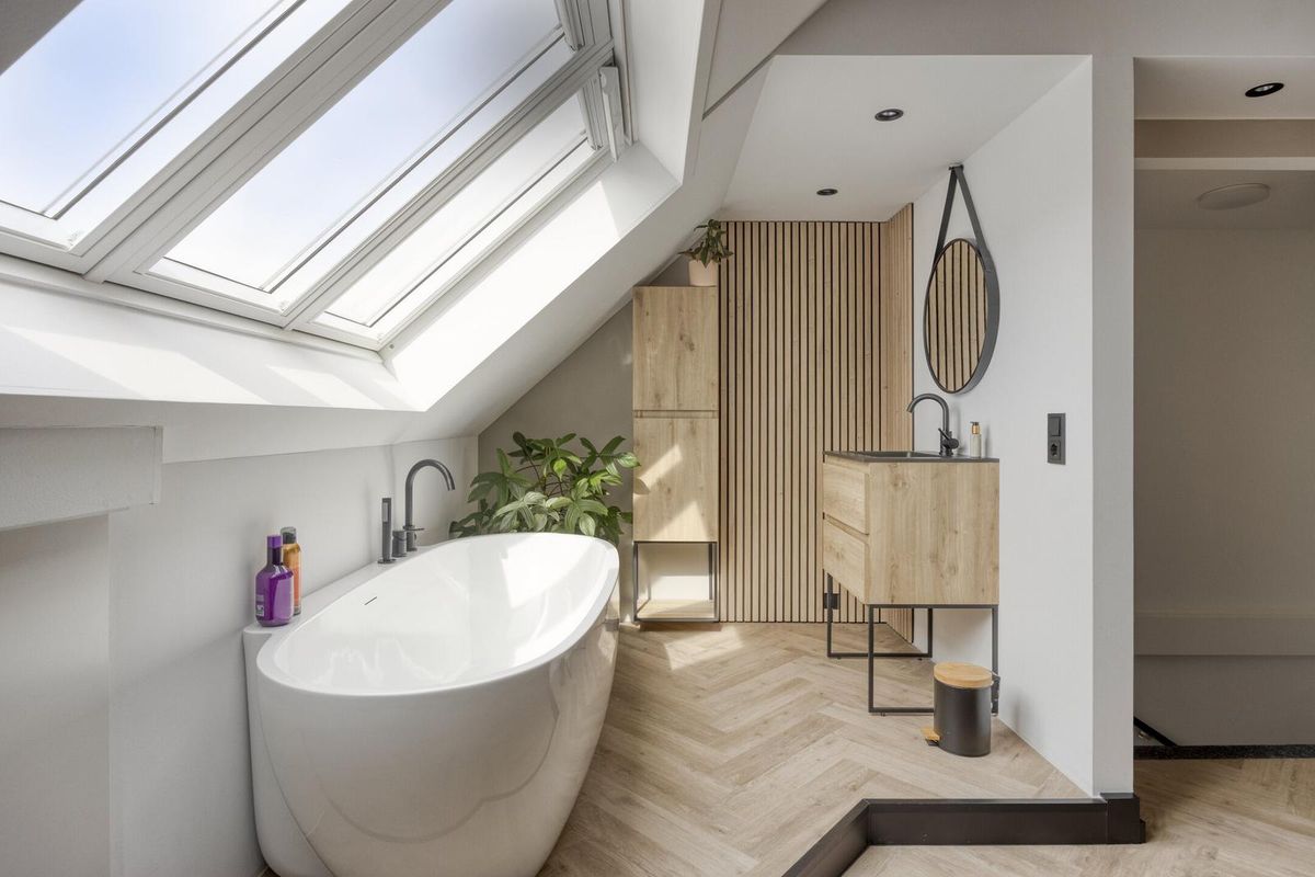 Een smaakvolle badkamer (ca 6,5m²) beschikt over een ligbad, inloopdouche, tweede zwevend toilet