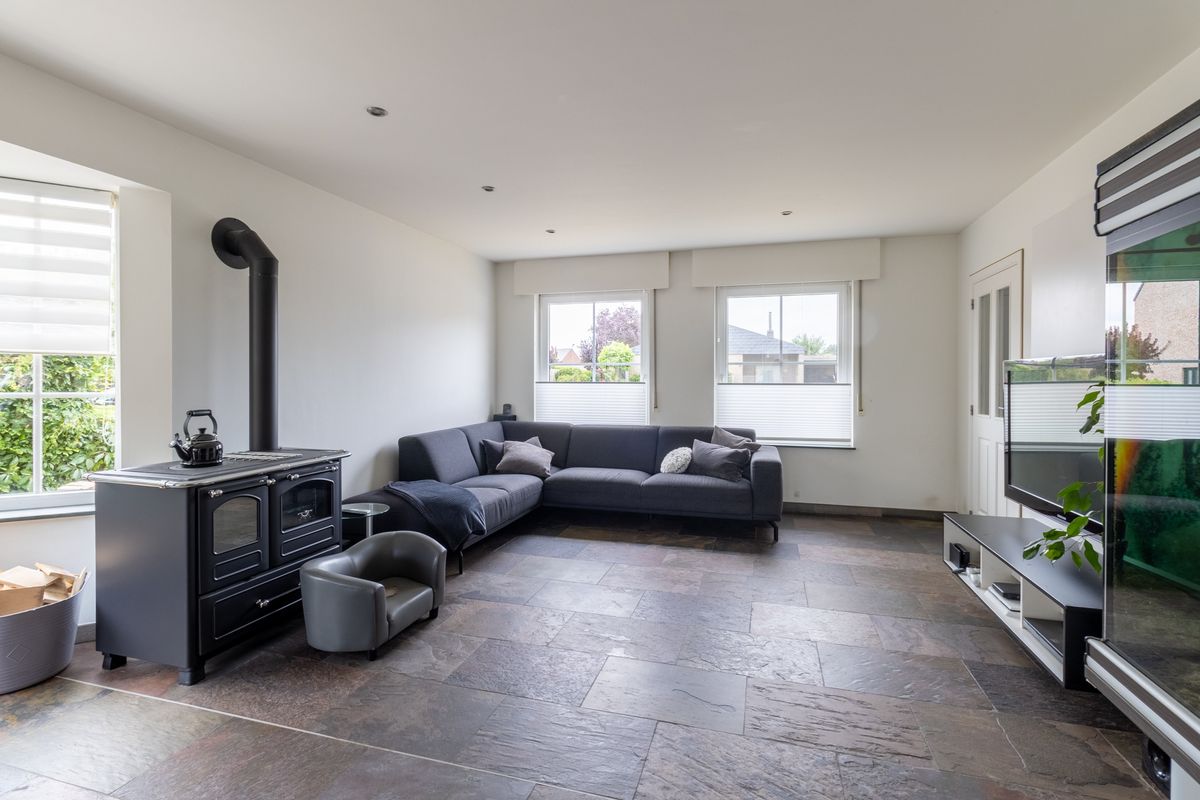 De woonkamer en eetkamer vormen één doorlopende leefruimte op stijlvolle natuursteen, baad in het natuurlijk licht en worden extra gezellig gemaakt door een houtkachel.