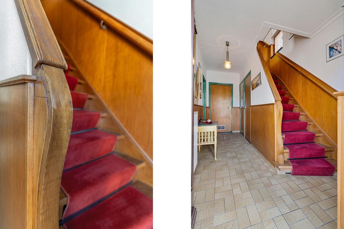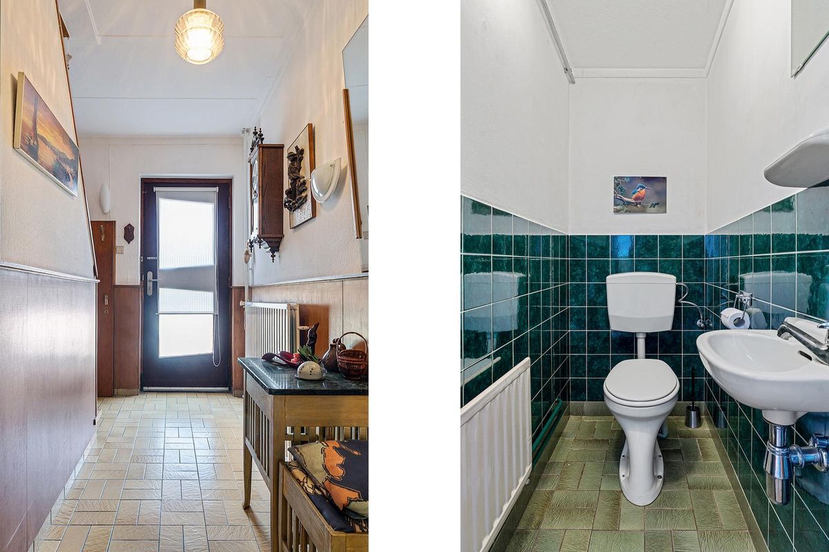 Bij binnenkomst stap je in de hal, die toegang biedt tot het toilet met fonteintje, de meterkast, de keldertrap, de trap naar de eerste verdieping, de woonkamer en de keuken met eetruimte.
