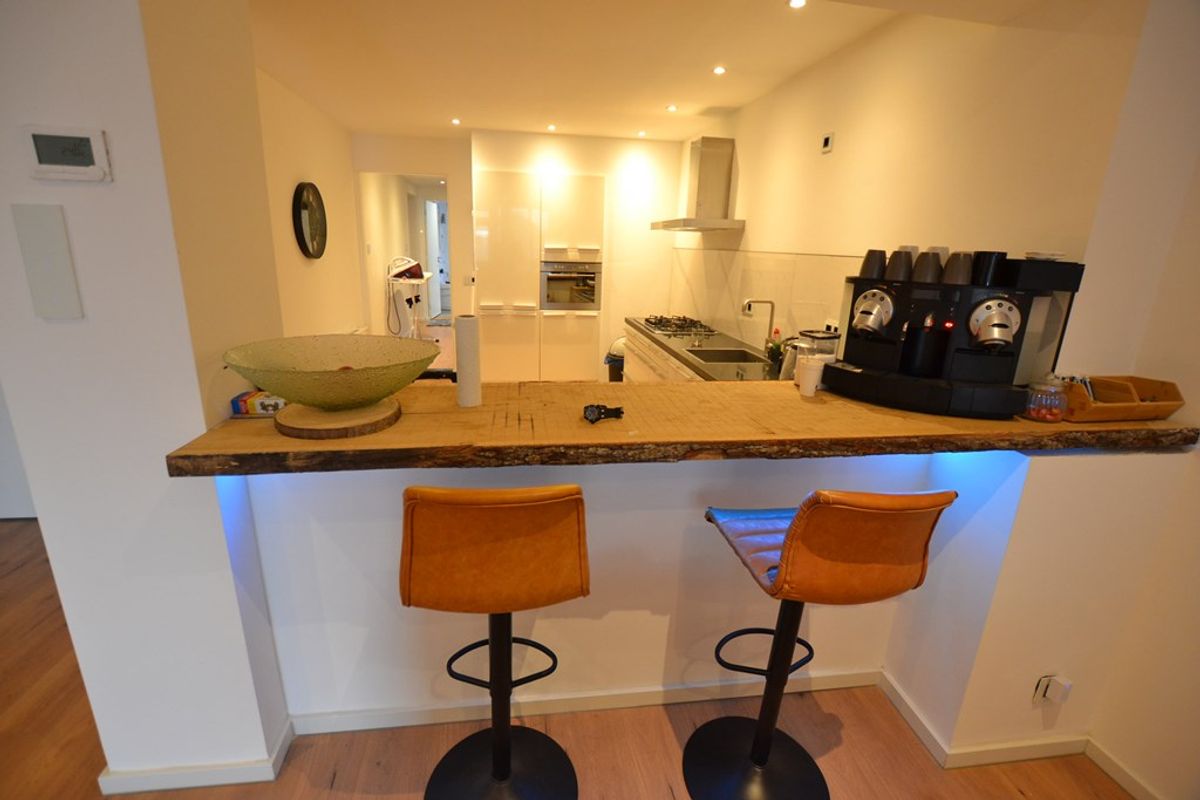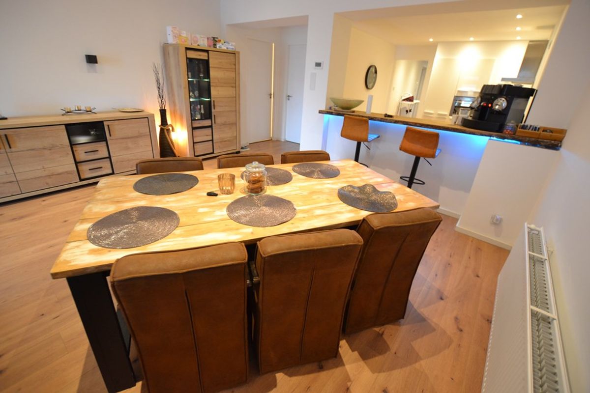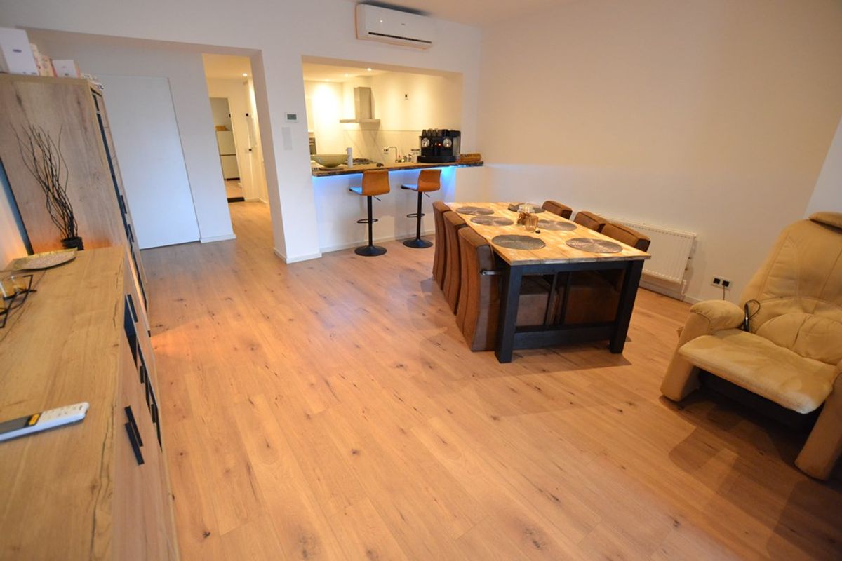 Woonkamer 10,45 x 5,50/4,95 met laminaatvloer, inbouwspots, airco, nieuwe meterkast met slimme meters en open keuken.