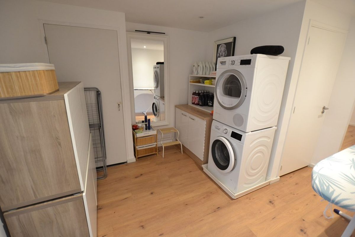 Bijkeuken/wasruimte 2,95 x 2,70 met laminaatvloer en inbouwspots.