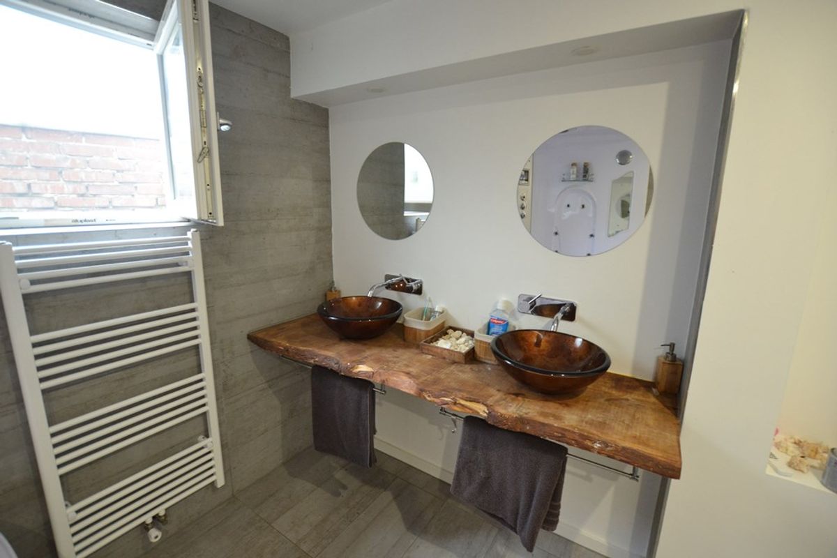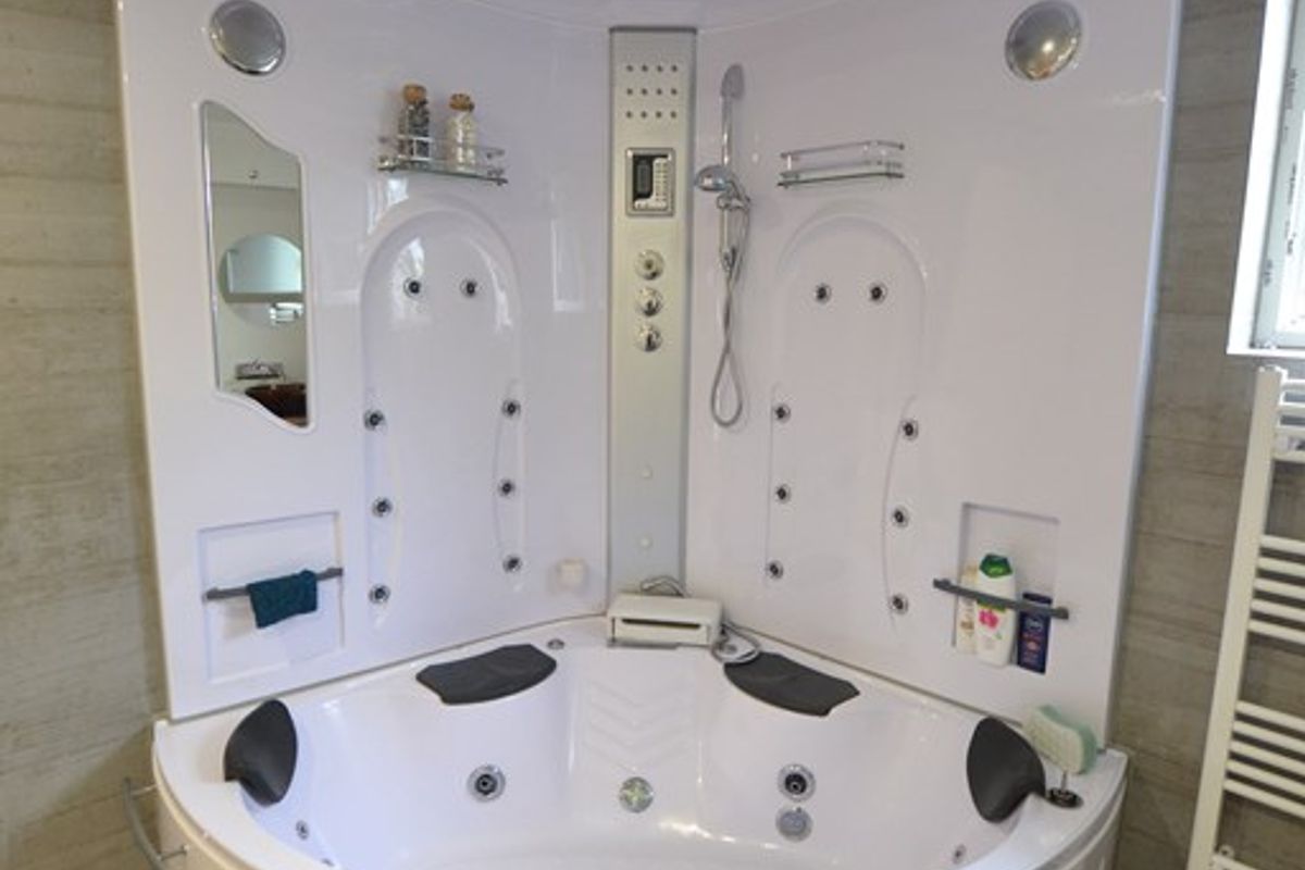 Badkamer 3,10 x 3,05 met plavuizenvloer, inbouwspots, hoekligbad met whirlpool, doublok, badkamermeubel met twee waskommen en design radiator.