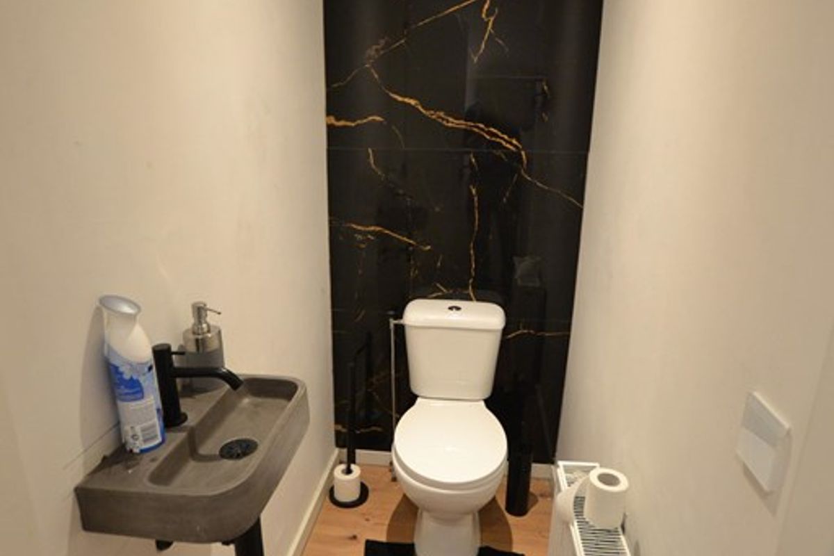 Toiletruimte 1,75 x 0,95 met laminaatvloer, duoblok en fonteintje.