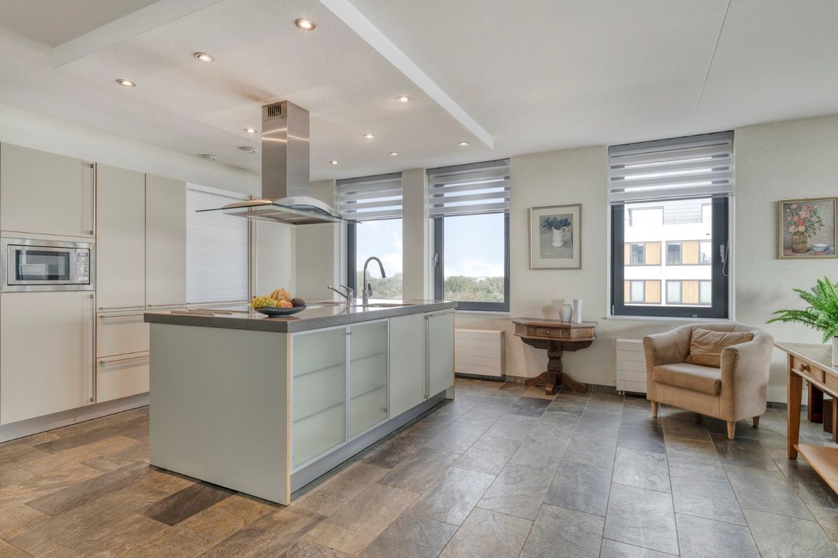 5e verdieping: ruime hal met dubbel openslaande deuren met volledig glas, bergkamer met opstelplaats voor de wasmachine en droger en WarmteTerugWin installatie voor de ventilatie, zwevend toilet met fonteintje, royale woonkamer met een natuurstenen vloer met vloerwarming, dubbele schuifpui naar de royale loggia met glasschermen, moderne open keuken met een kookeiland en diverse inbouwapparatuur, 1e badkamer is voorzien van een douchehoek, whirlpool ligbad, dubbel wastafelmeubel en 2e toilet, 2e badkamer is voorzien van een wastafelmeubel en douche.
