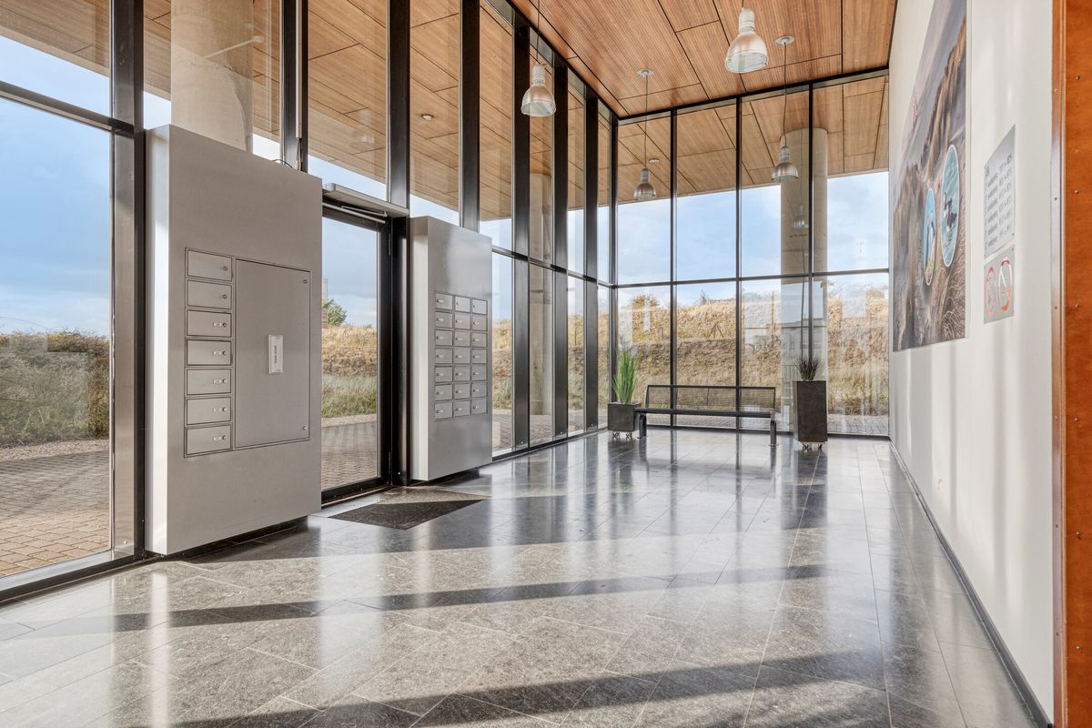 Begane grond: centrale hal met lift, trappenhuis, videosysteem en brievenbussen.
