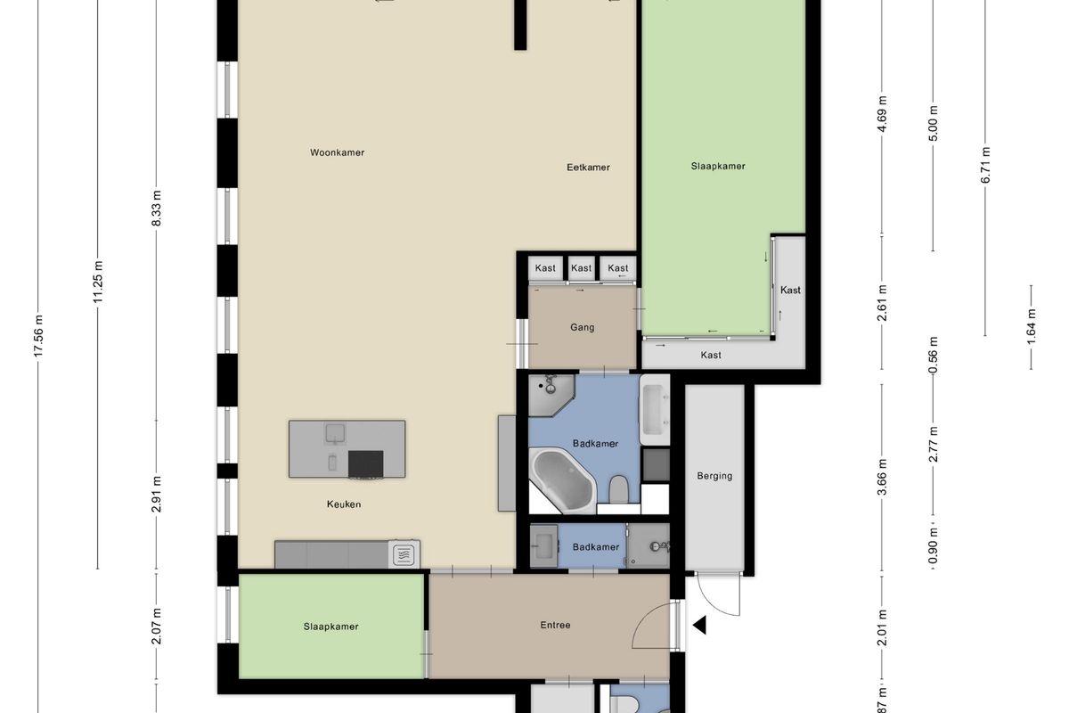 De 1e slaapkamer aan de Waterwegzijde heeft een vaste kastenwand en een schuifpui naar de loggia. De eetkamer kan mogelijk ook als 3e slaapkamer ingericht worden.