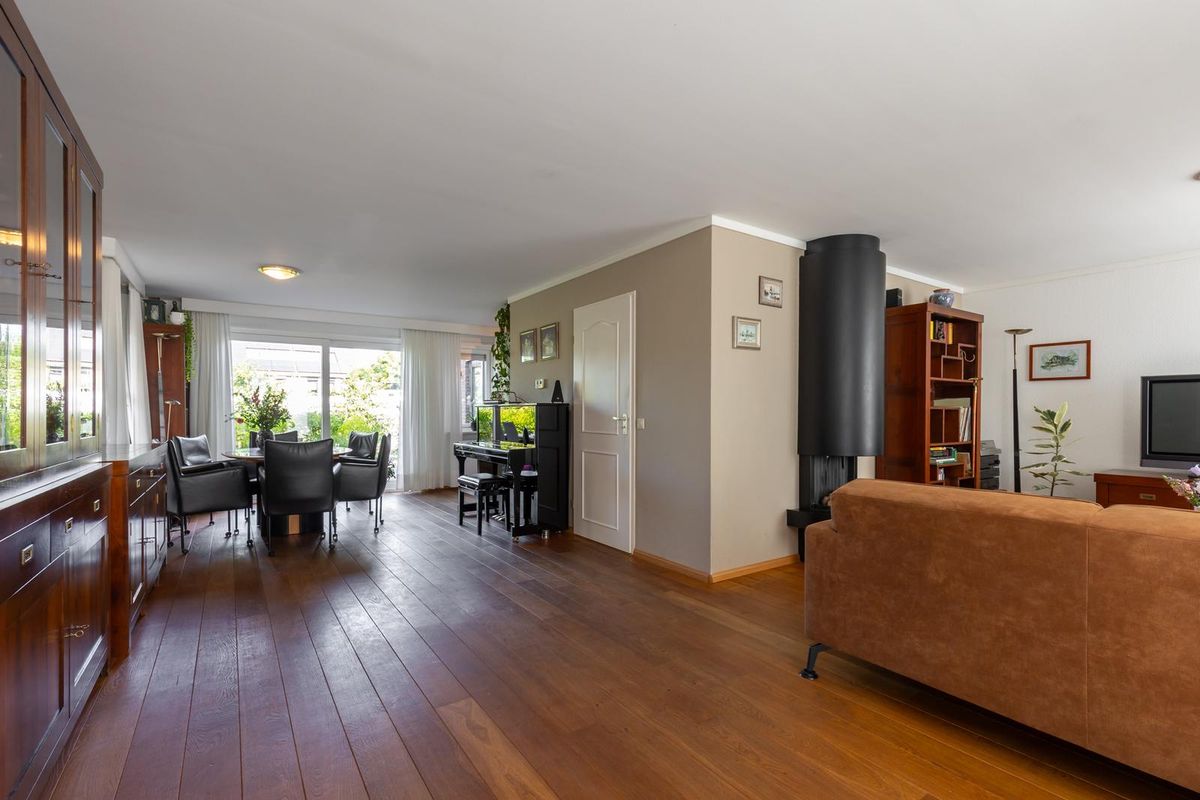 Sfeervolle L-vormige woonkamer met met gashaard en eiken vloerdelen parketvloer die doorloopt naar de keuken, de schuifpui geeft toegang naar de tuin.