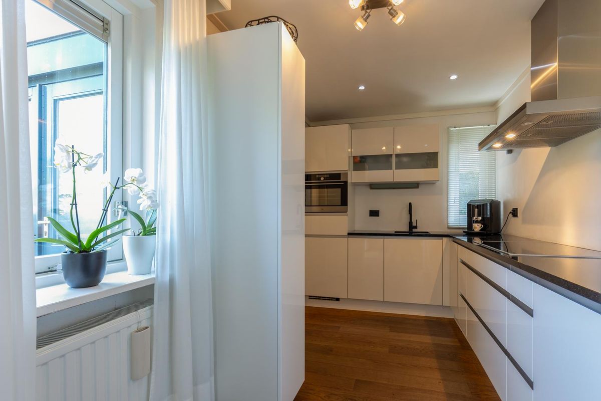 Bijkeuken met de aansluiting voor de wasapparatuur, de vaatwasser (2019) en toegang naar tuin. Vanuit de bijkeuken is de inpandige garage met sectionaal poort bereikbaar, ook vanuit hier toegang tot de tuin.