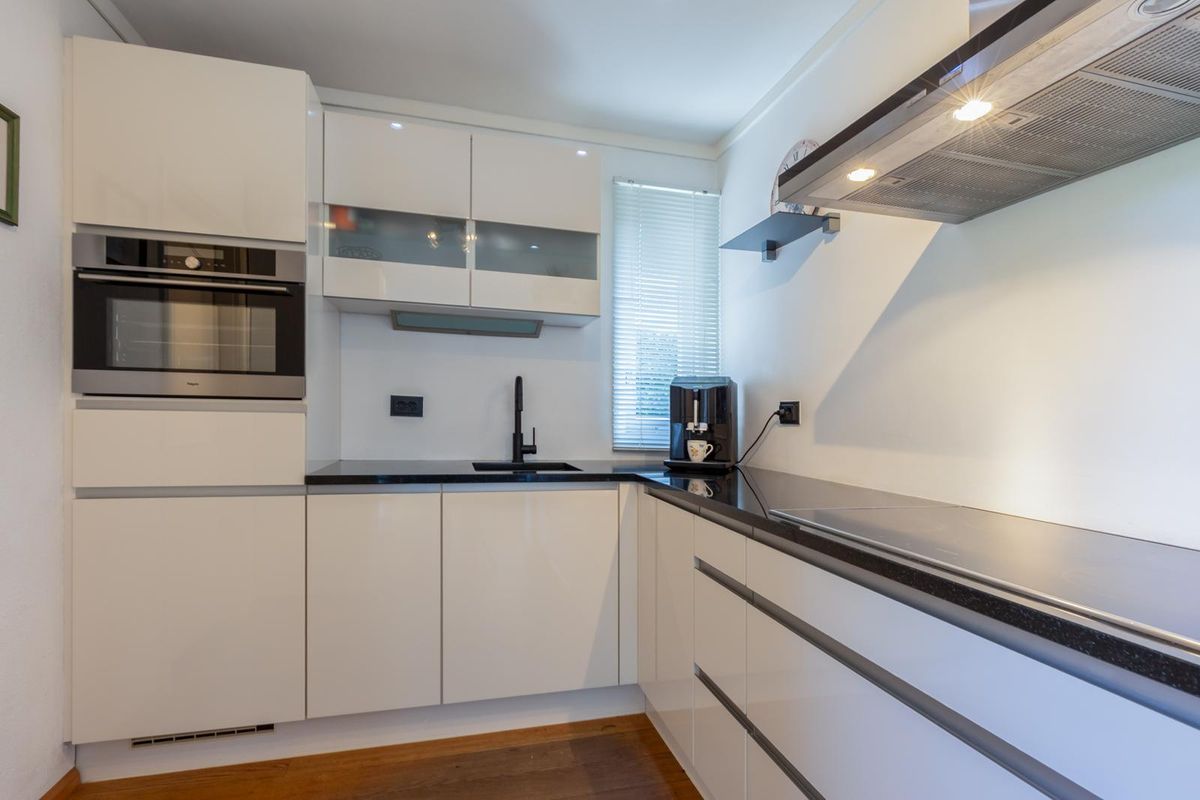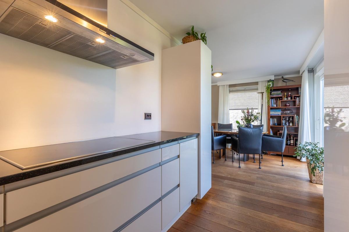 Semi open keuken voorzien van een moderne opstelling (2015) voorzien van een inductie kookplaat, afzuigkap, oven (2023) en koelkast.