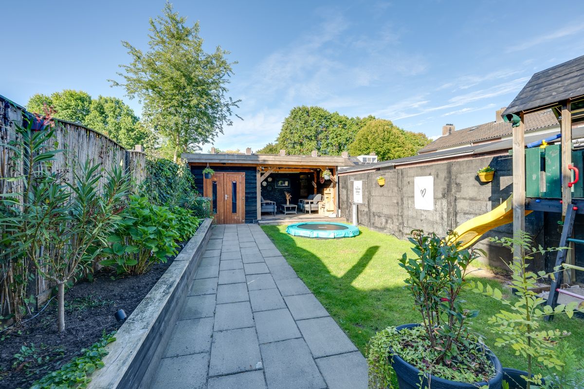 De achtertuin (17,36 m. x 7 m.) ligt op het zuidwesten. De tuin is voorzien van een gazon, vaste beplanting, sierbestrating, tuinverlichting en een buitenkraan. Achter in de tuin staat een berging in L-vorm (6,72 m. x 2,46 m. en 3,31 m. x 2,31 m.) v.v. een dubbele deur en elektra. Daarnaast is een gezellige, houten overkapping (4,40 m. x 3,35 m.) gebouwd, tevens v.v. elektra. Direct achter de woning is een zijpoort.