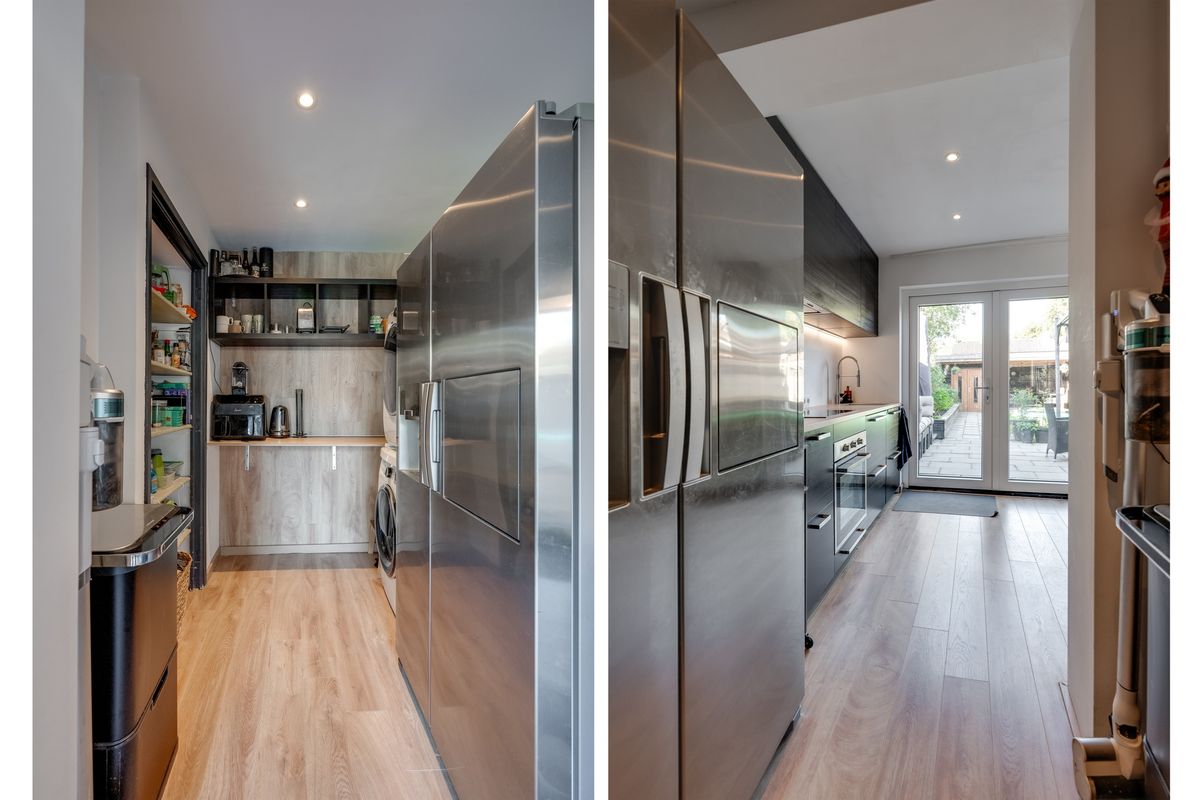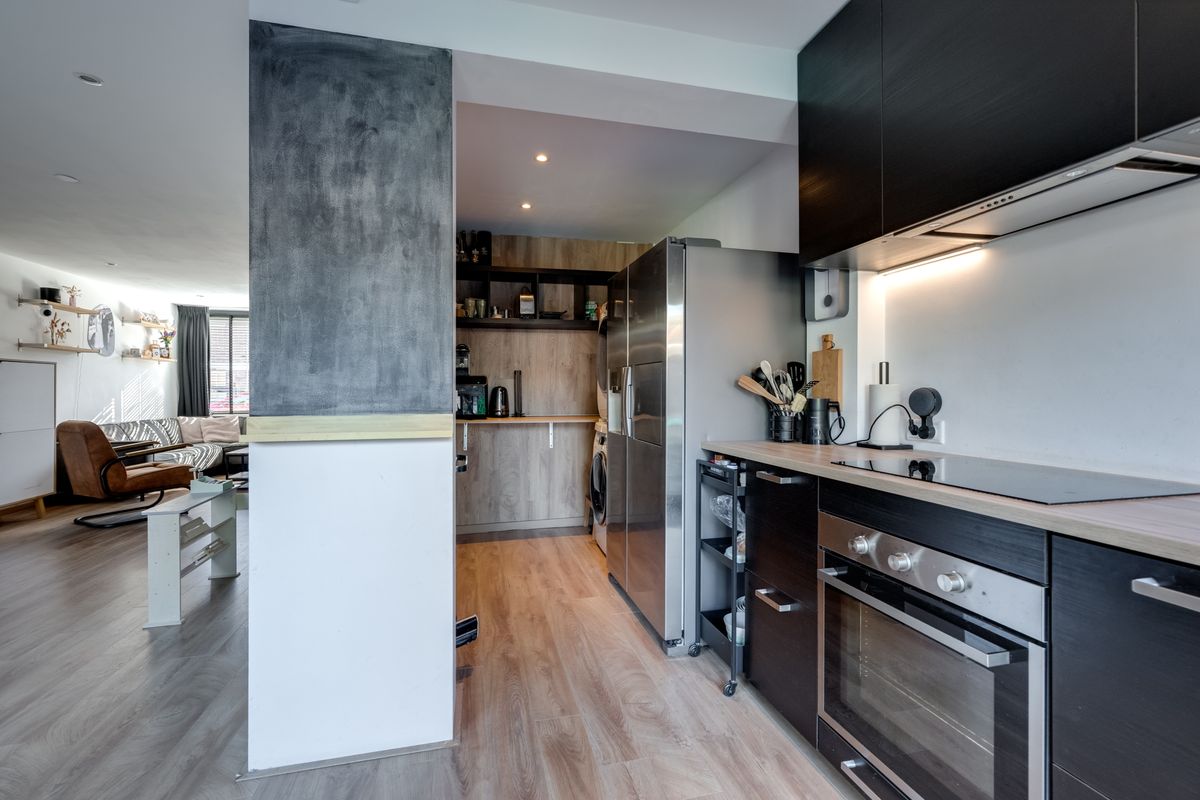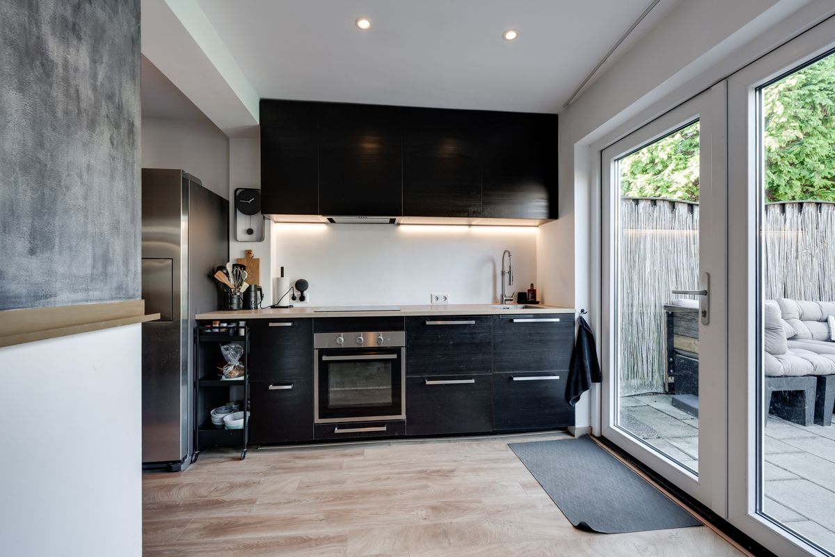 De keuken (4,67 m. x 2,04 m.) ligt aan de achterzijde en heeft een zwart keukenblok v.v. een losse koel-/vriescombinatie, een vaatwasser, een 4-pits inductie kookplaat, een afzuigkap en een heteluchtoven. In de ruimte naast de keuken vindt u de wasaansluitingen en extra bergruimte. Er zijn dubbele, openslaande deuren (2017) naar de tuin.
