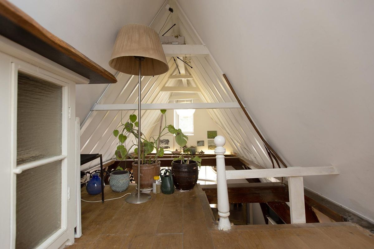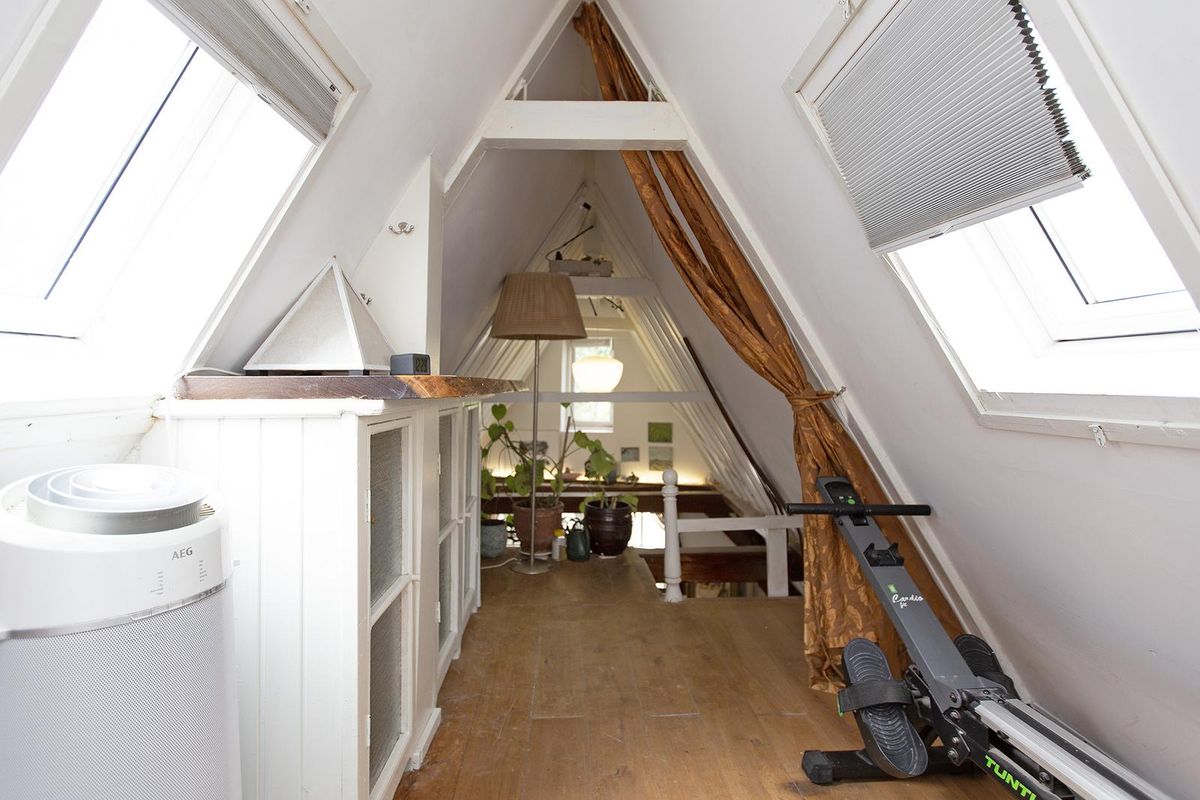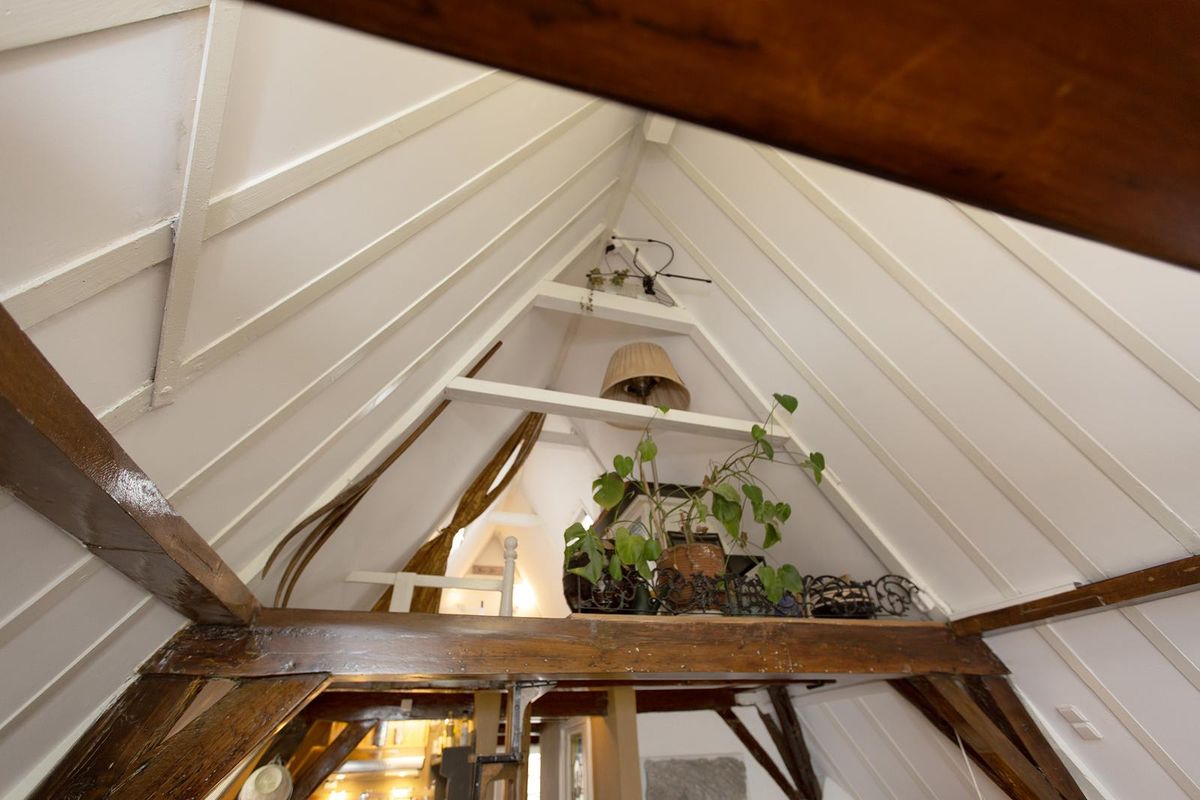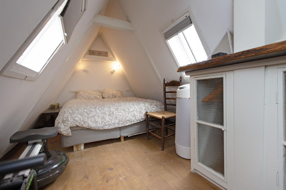 Via de trap bereikt u de sfeervolle vide op de bovenverdieping, met een comfortabel tweepersoonsbed en handige kastruimte.