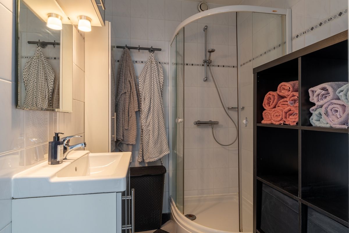 De slaapkamer is een oase van rust – geen getoeter, geen drukte, alleen jij en dat heerlijke vrije uitzicht over het groen. Hier slaap je uit zonder wekker (tenzij de zon je vriendelijk wekt). De wasmachine heeft z’n plekje ook in deze kamer, handig en dichtbij. De badkamer is compact maar keurig: een douche, wastafelmeubel en voldoende ruimte voor je dagelijkse spulletjes.