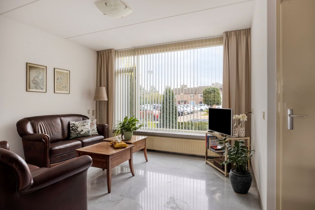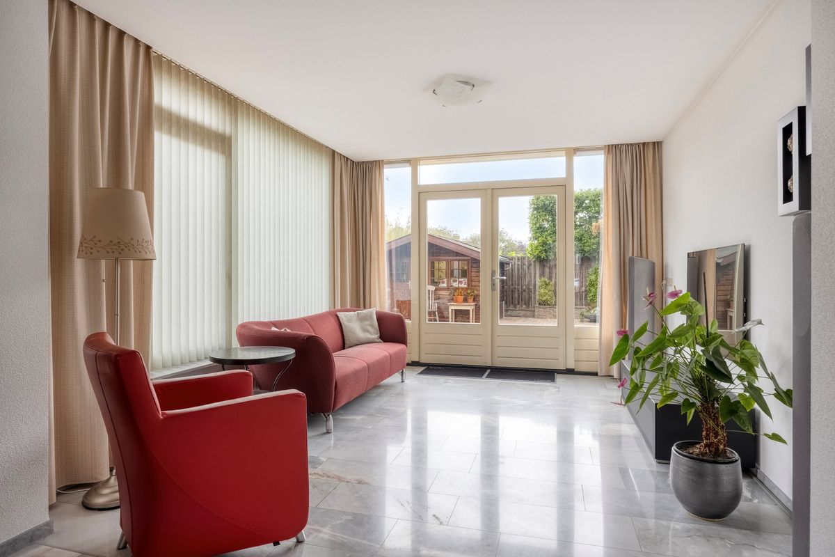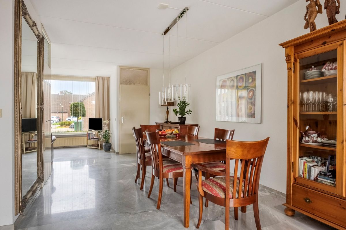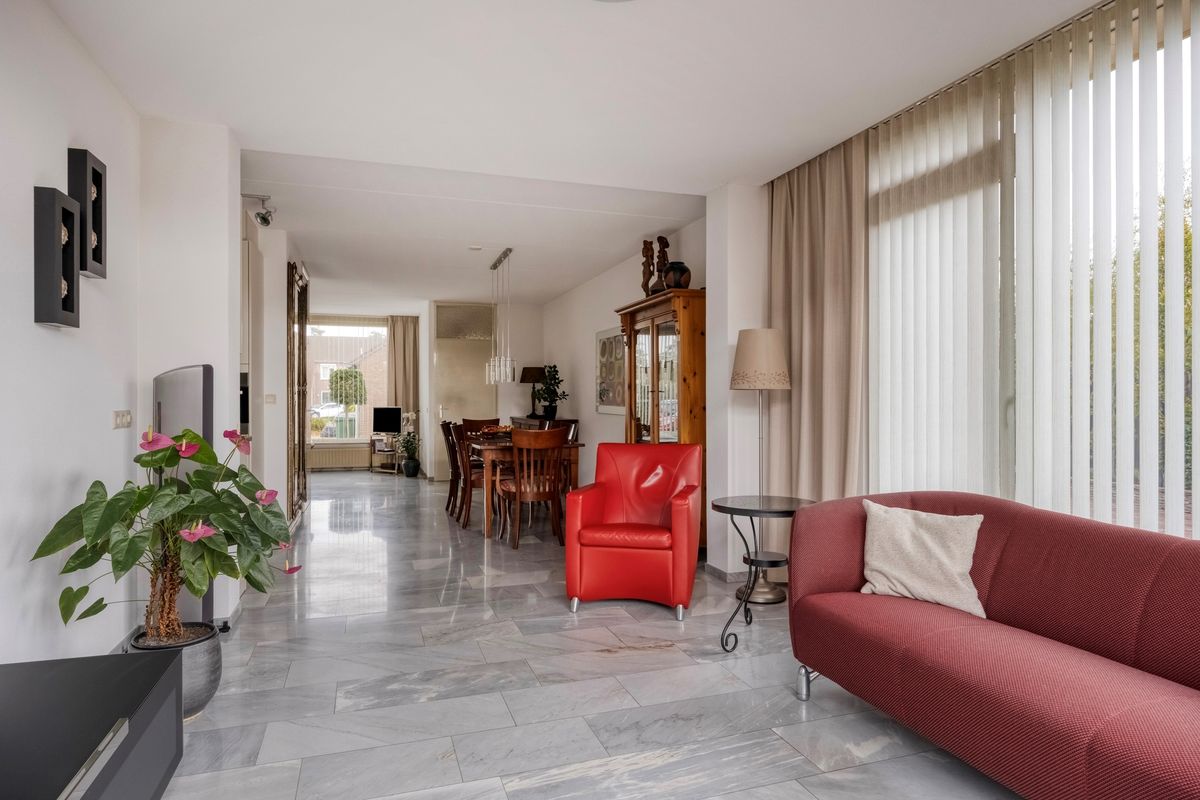 Via de voordeur stap je binnen in de entreehal, waar meteen plek is voor jassen en schoenen en de meterkast. Wat meteen opvalt: deze woning is altijd met zorg en aandacht bewoond. De afwerking is verzorgd en de ruimtes voelen warm aan mede dankzij de marmeren vloer.