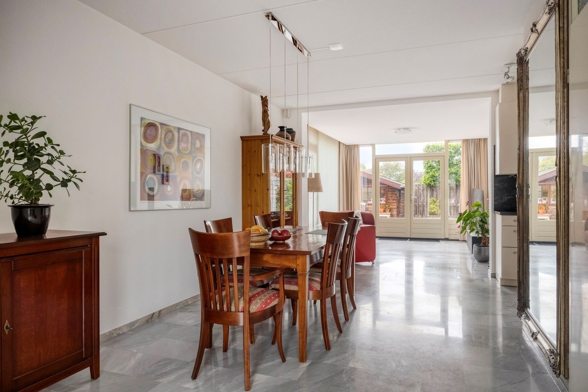 Vanuit de keuken loop je zo door naar de royale uitbouw die in 2015 is gerealiseerd. In deze uitgebouwde ruimte is nu een sfeervolle eethoek gemaakt met openslaande deuren naar de tuin. Dankzij de ligging en grootte is dit echt het hart van de woning – een plek waar je met gemak een grote eettafel kwijt kunt, of de ruimte gebruikt als tweede zithoek.