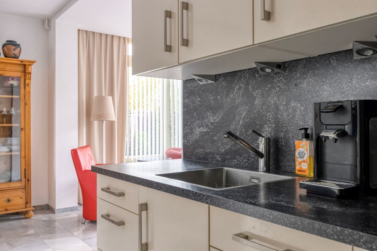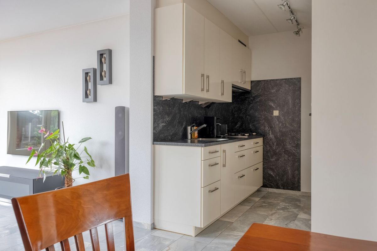 Aan de voorzijde ligt de woonkamer, met een fijne lichtinval. In het hart van de woning bevindt zich de keuken, compleet met koelkast en vriesvak, combi-oven/magnetron, 4-pits gasfornuis, vaatwasser, mechanische ventilatie en een handige trapkast.