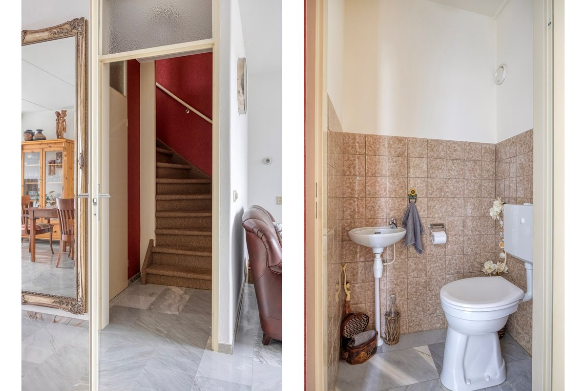 Centraal in de woning bevindt zich de gesloten gang met de trapopgang naar boven én het toilet met fonteintje – praktisch geplaatst, buiten het zicht van de woon- en eetruimte.
