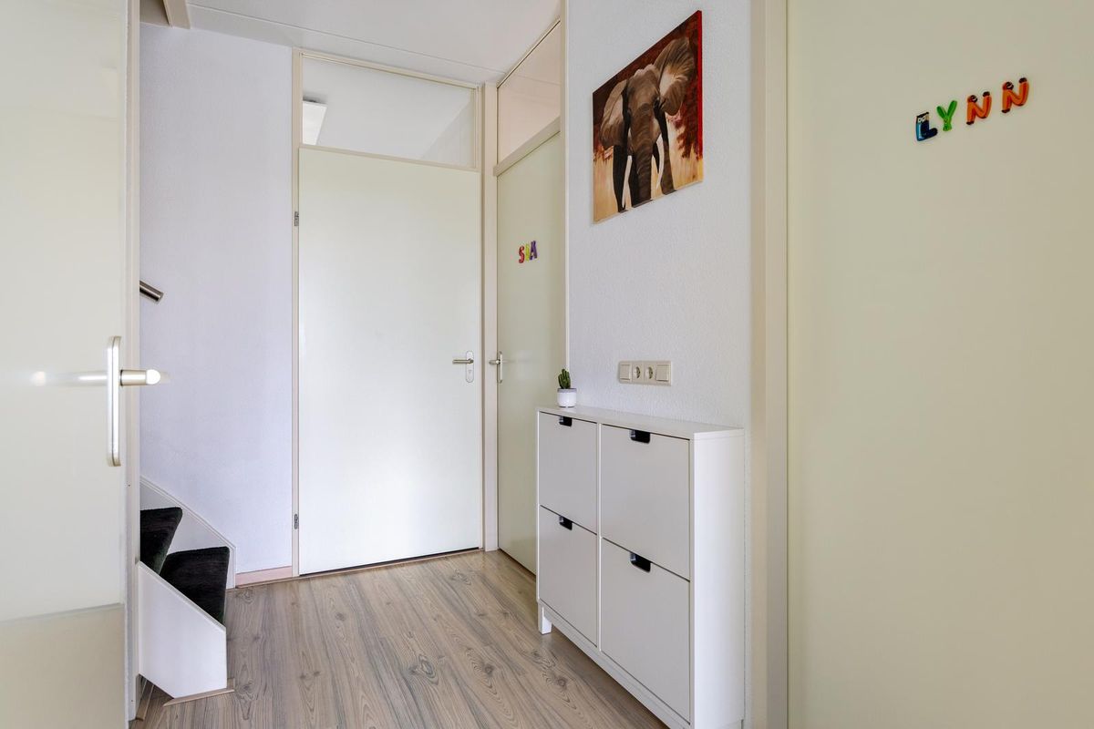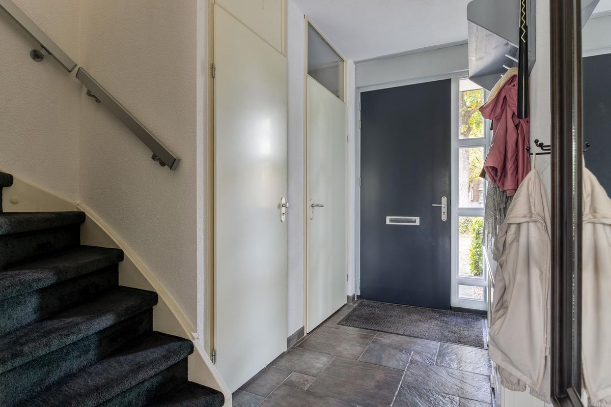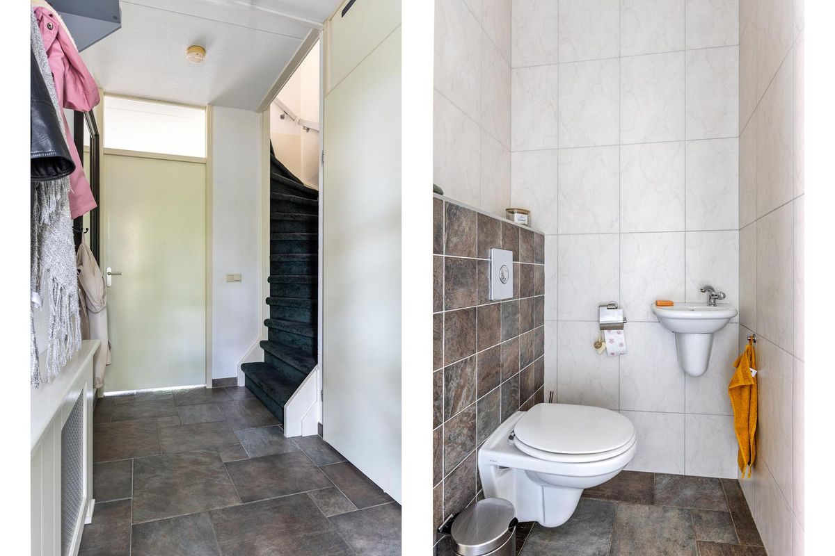 Parkeer je auto eenvoudig in de straat en loop via de voortuin naar de entree. De hal is al meteen een fijne binnenkomer, dankzij het natuurlijke lichtinval van de zijramen. De stijlvolle tegelvloer loopt door naar de woonkamer, wat zorgt voor een strakke, rustige uitstraling. Vanuit de hal heb je toegang tot het toilet, de trap naar boven en de leefruimte.