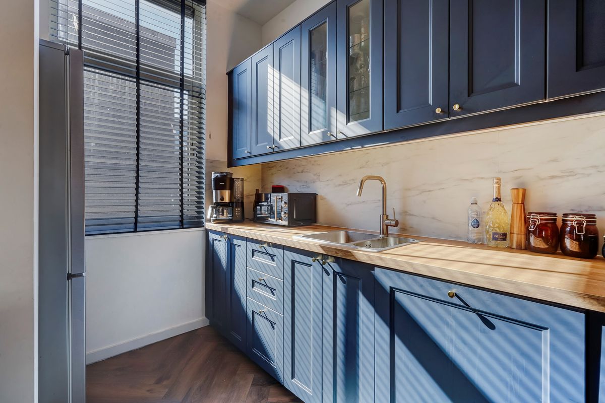 Aan de achterzijde is ook de keuken geplaats. De keuken is volledig nieuw geplaatst en voorzien van een vaatwasser, losstaande koel-/vriescombinatie, luxe kraan, inductie kookplaat, afzuigkap en veel kastruimte. Er is ook een bar, als vast deel van de keuken, met barkrukken. Ook in de keuken is een groot raam geplaatst, dat veel licht geeft.