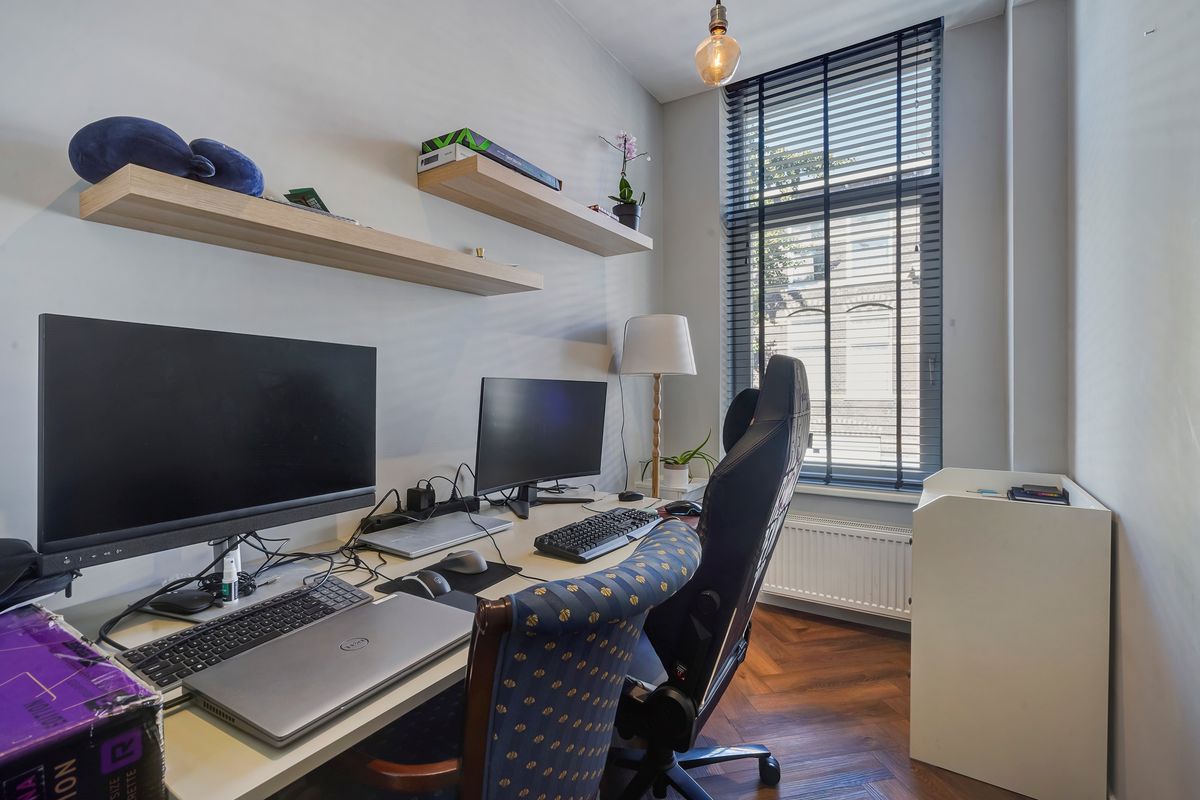 Vanaf de overloop is er ook toegang tot de eerste slaapkamer. Deze kamer is gelegen aan de voorzijde van de woning. De kamer is thans in gebruik als werkkamer en kan gemakkelijk als slaapkamer worden ingericht.