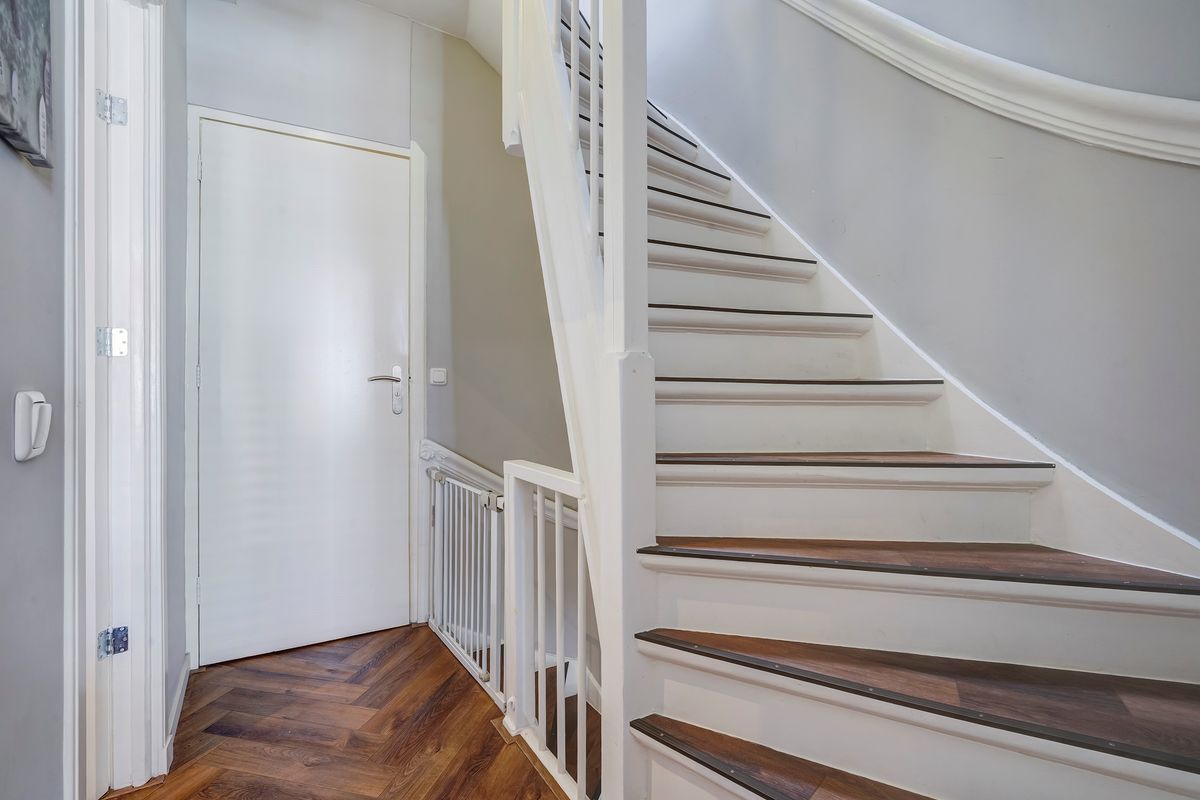 Een mooi beklede en geschilderde trap geeft toegang tot de tweede verdieping.