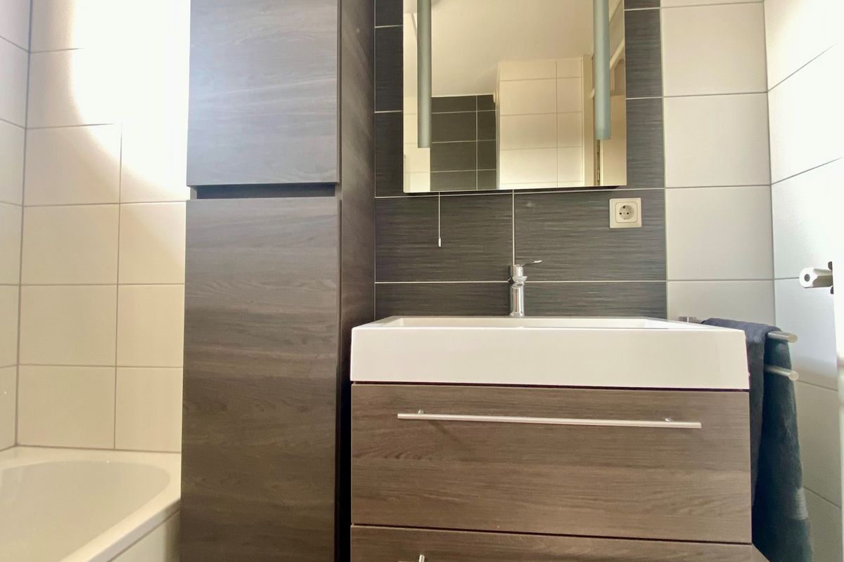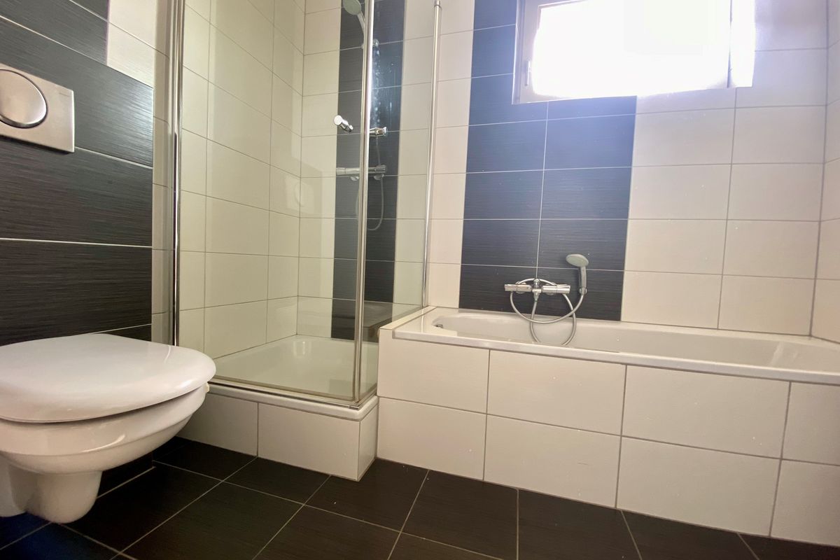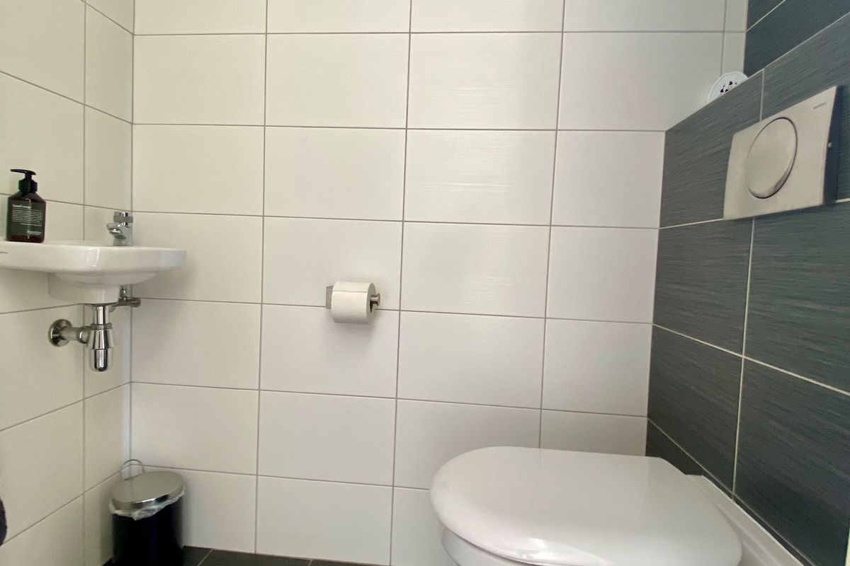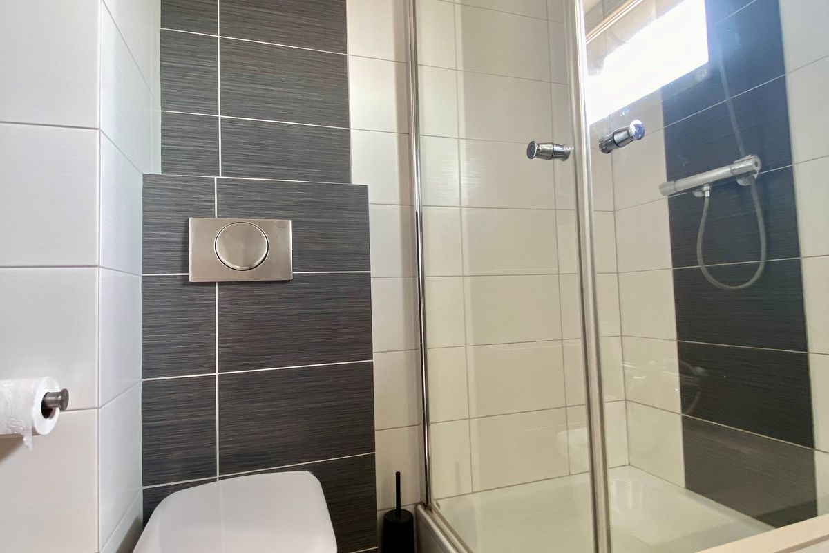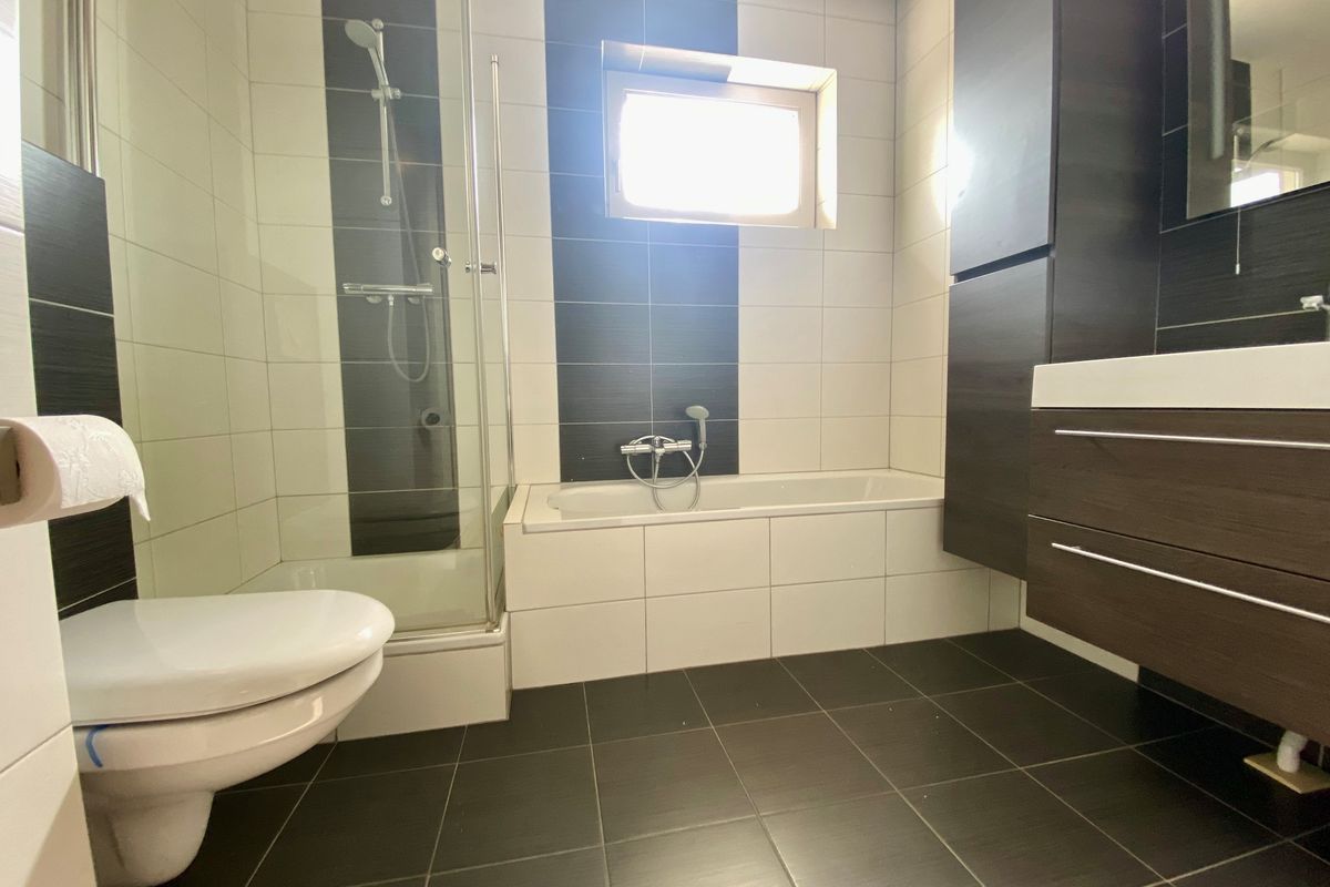 - Volledig betegelde, moderne badkamer met douchecabine, ligbad, tweede toilet en wastafelmeubel