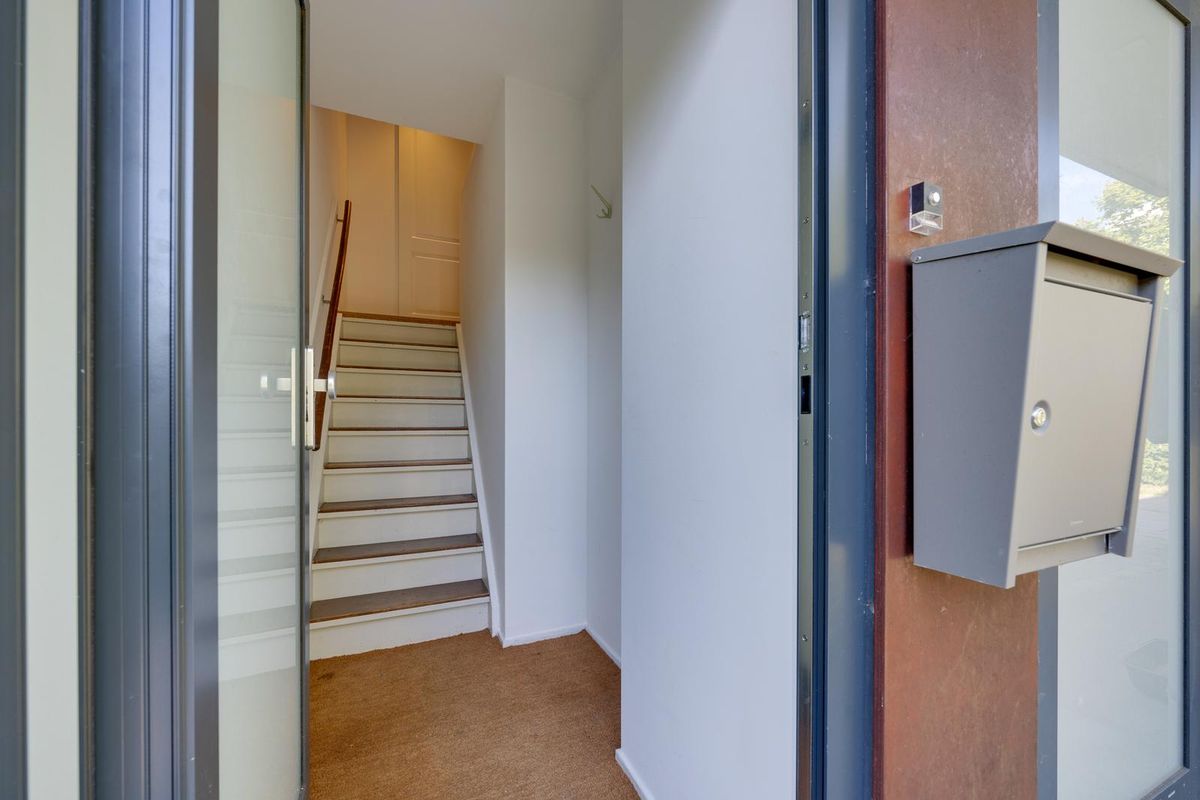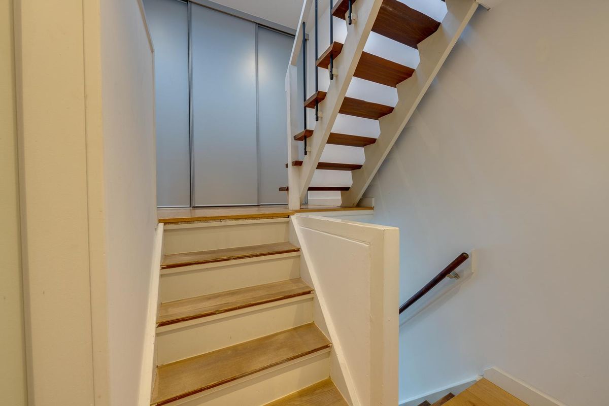 Via de entree en trap kom je op de eerste overloop. Hier bevindt zich de badkamer, stijlvol weggewerkt achter een schuifdeur die oogt als een kast. De badkamer is voorzien van een inloopdouche, wastafel en toilet.