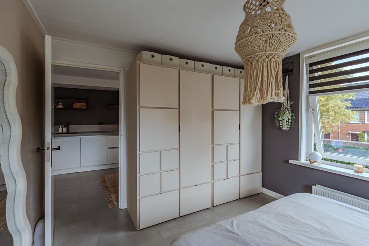 Middels de trapopgang in de woonkamer toegang tot de overloop welke in directe verbinding staat met de wasruimte en de drie slaapkamers. De wasruimte cq. technische ruimte is uitgerust met de CV-ketel, een wasmeubel, de zonnepanelenomvormer en de witgoedaansluitingen. De eerste twee slaapkamers op deze woonlaag zijn gelegen aan de achterzijde van de woning en uitgerust met een dakkapel met een rolluik voor de ramen. De vierde ruime slaapkamer is aan de voorzijde gesitueerd en eveneens voorzien van een dakkapel. Vanaf deze kamer heb je een leuke kijk op de Thorbeckelaan.