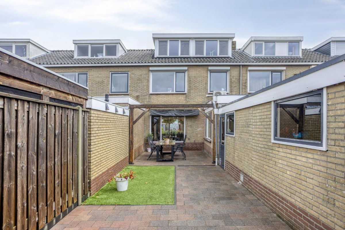 De tuin biedt voldoende ruimte voor een gezellige loungeset of eettafel, en de stenen berging aan de achterzijde zorgt voor handige extra opslag.