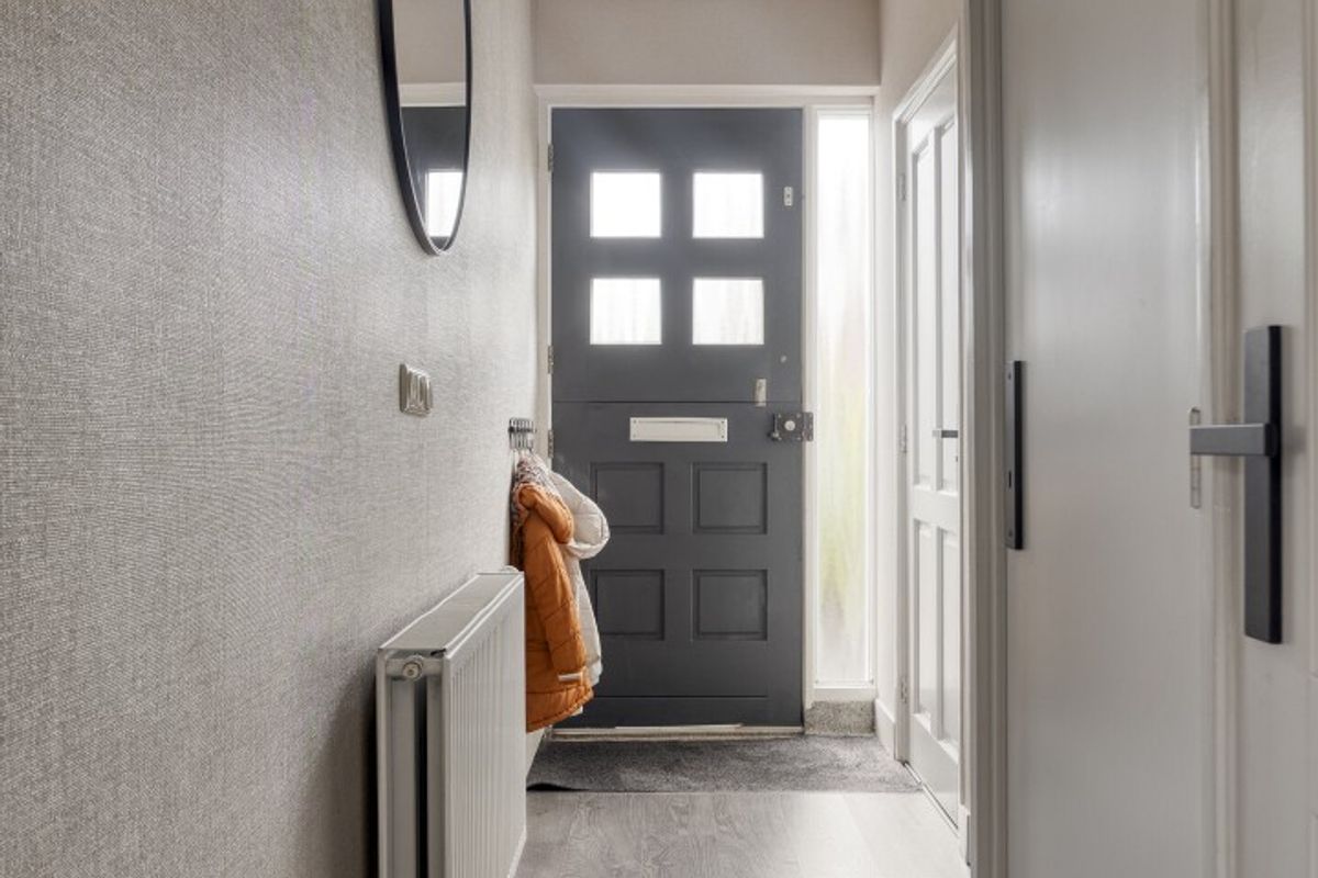 Je komt binnen in de hal met meterkast, trapopgang en toilet.