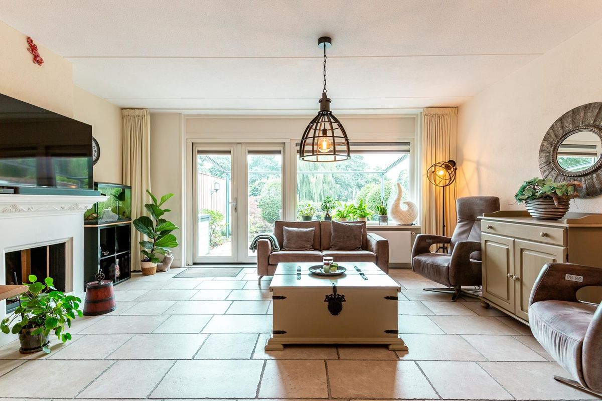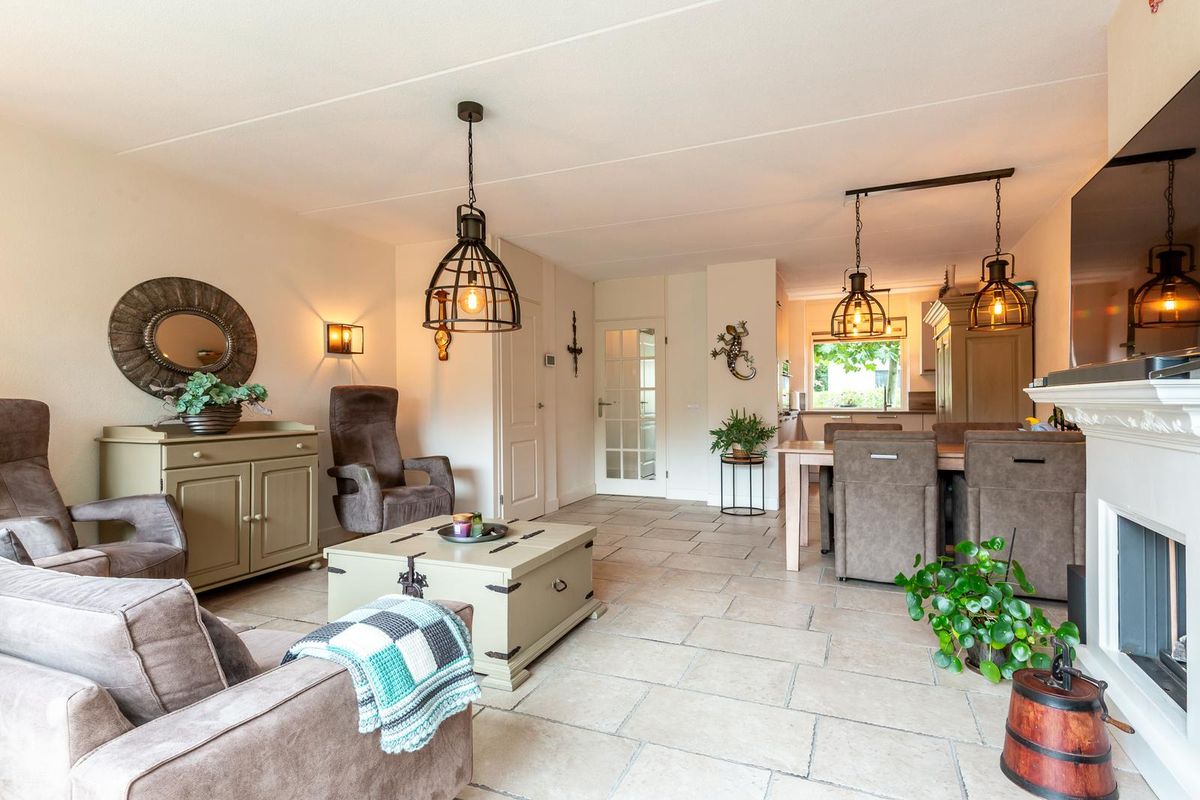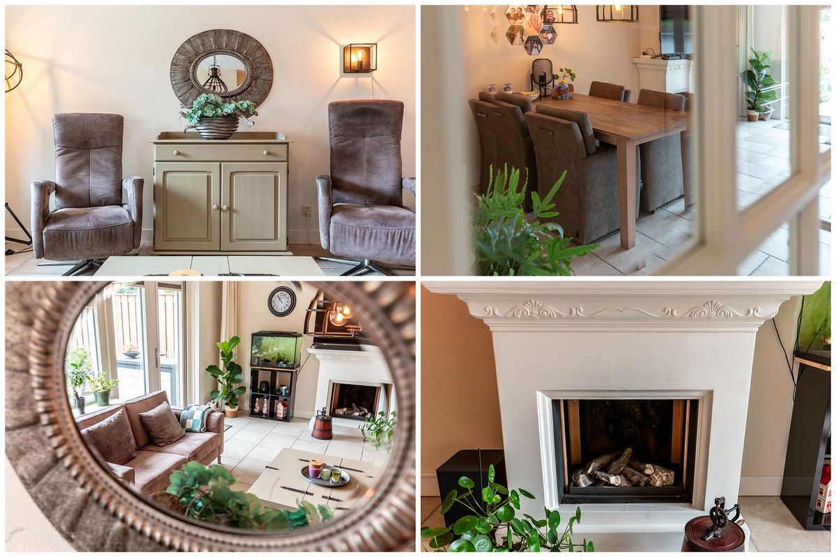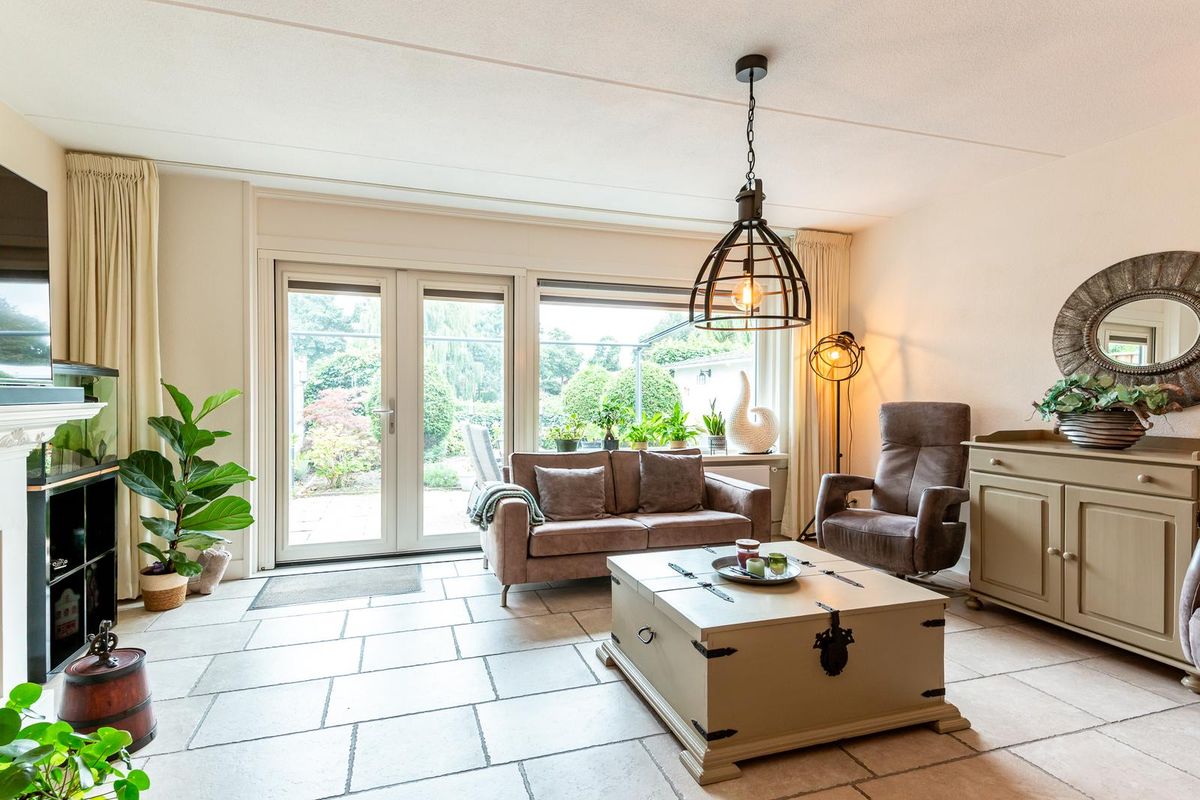 De woonkamer is ruim opgezet en biedt genoeg plek voor een gezellige zithoek én een grote eettafel. Dankzij de dubbele openslaande kunststof deuren met ingebouwde jaloezieën is er een mooie verbinding met de achtertuin en komt er veel licht binnen.