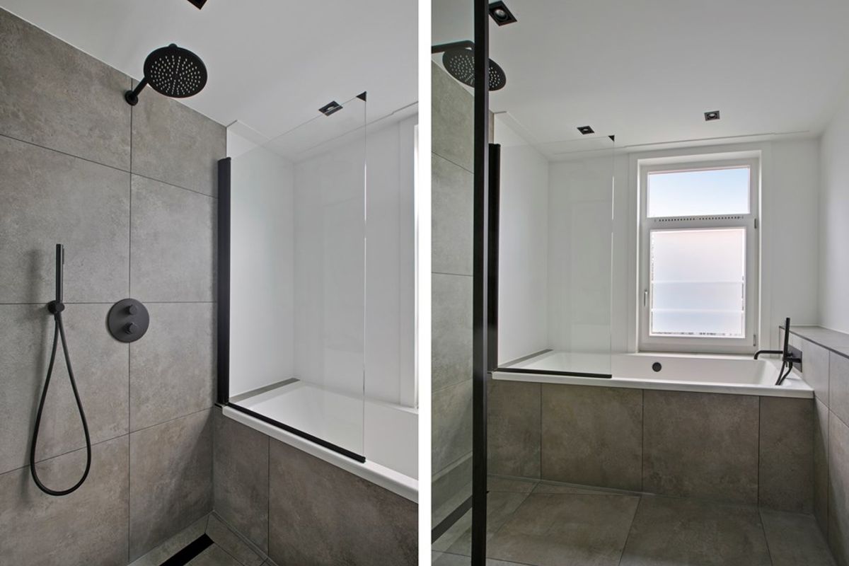 From the landing, you access the separate toilet and the luxurious bathroom. The bathroom is sleekly finished and fully equipped with a comfortable bathtub, a walk-in shower, and a vanity unit. The built-in fixtures enhance the calm, modern aesthetic with attention to detail.