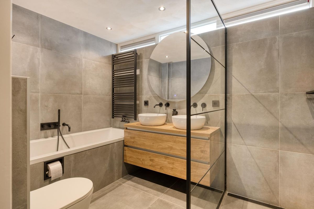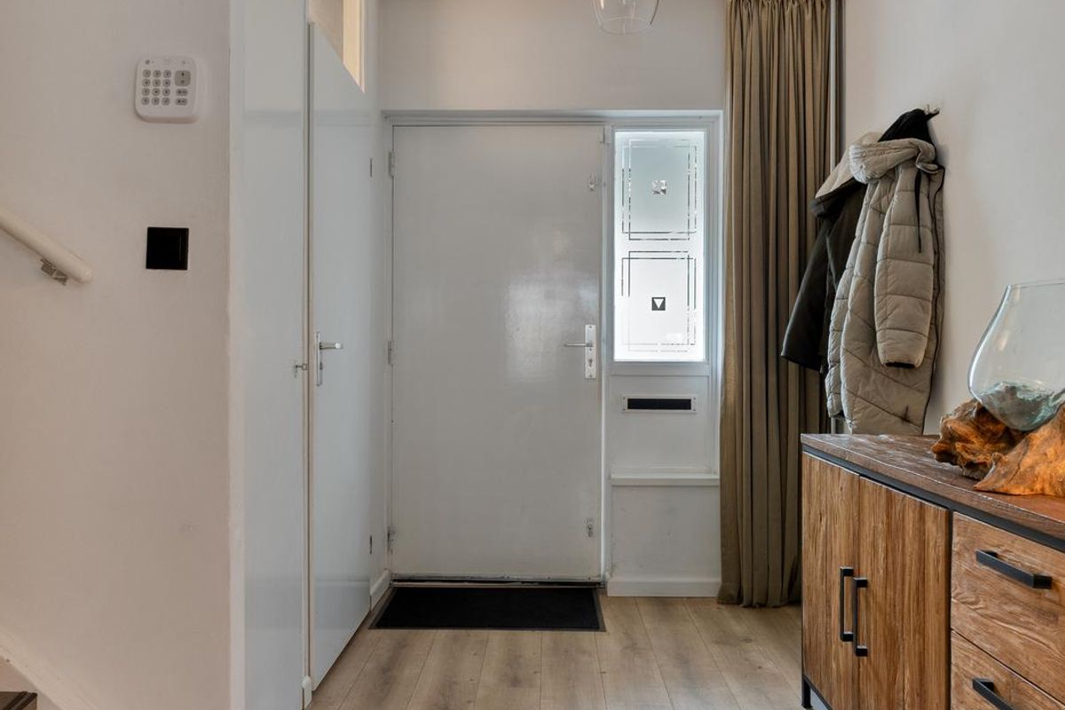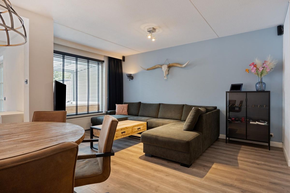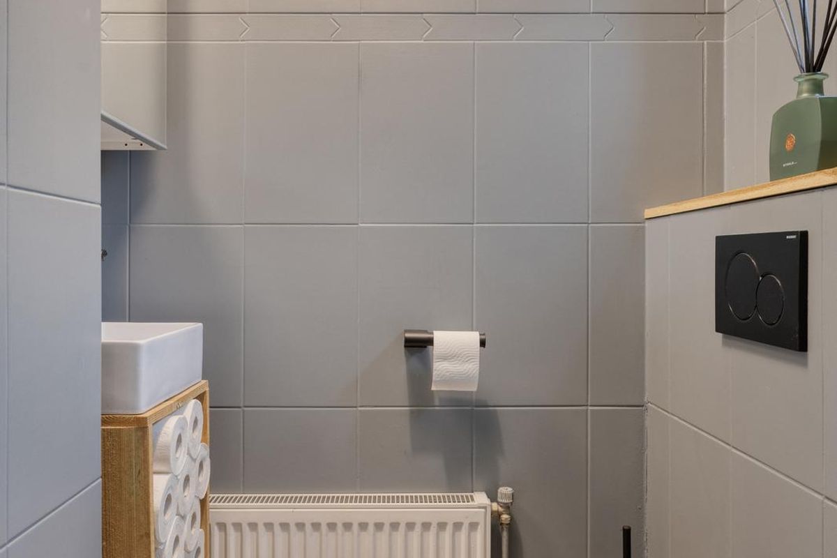 Entering through the spacious hallway with toilet, you step into the bright living room with open kitchen. Thanks to the rear extension, a generous living area has been created where light, tranquillity and comfort come together. The sleek finish, modern flooring and large windows create a pleasant, homely atmosphere. The open kitchen is both practical and stylish, equipped with built-in appliances such as an induction hob, dishwasher, oven, microwave and extractor hood. A place where cooking and being together come naturally.