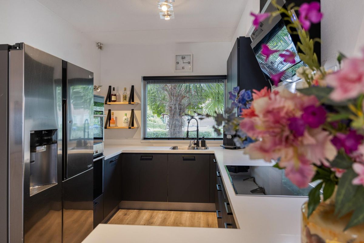 Binnenkomend via de ruime hal met toilet stap je de lichte woonkamer met open keuken binnen. Door de uitbouw aan de achterzijde is er een royale leefruimte ontstaan waar licht, rust en comfort samenkomen. De strakke afwerking, moderne vloer en grote ramen zorgen voor een prettige, huiselijke sfeer. De open keuken is praktisch en stijlvol, voorzien van inbouwapparatuur zoals een inductiekookplaat, vaatwasser, oven, magnetron en afzuigkap. Een plek waar koken en samenzijn vanzelf gaan.