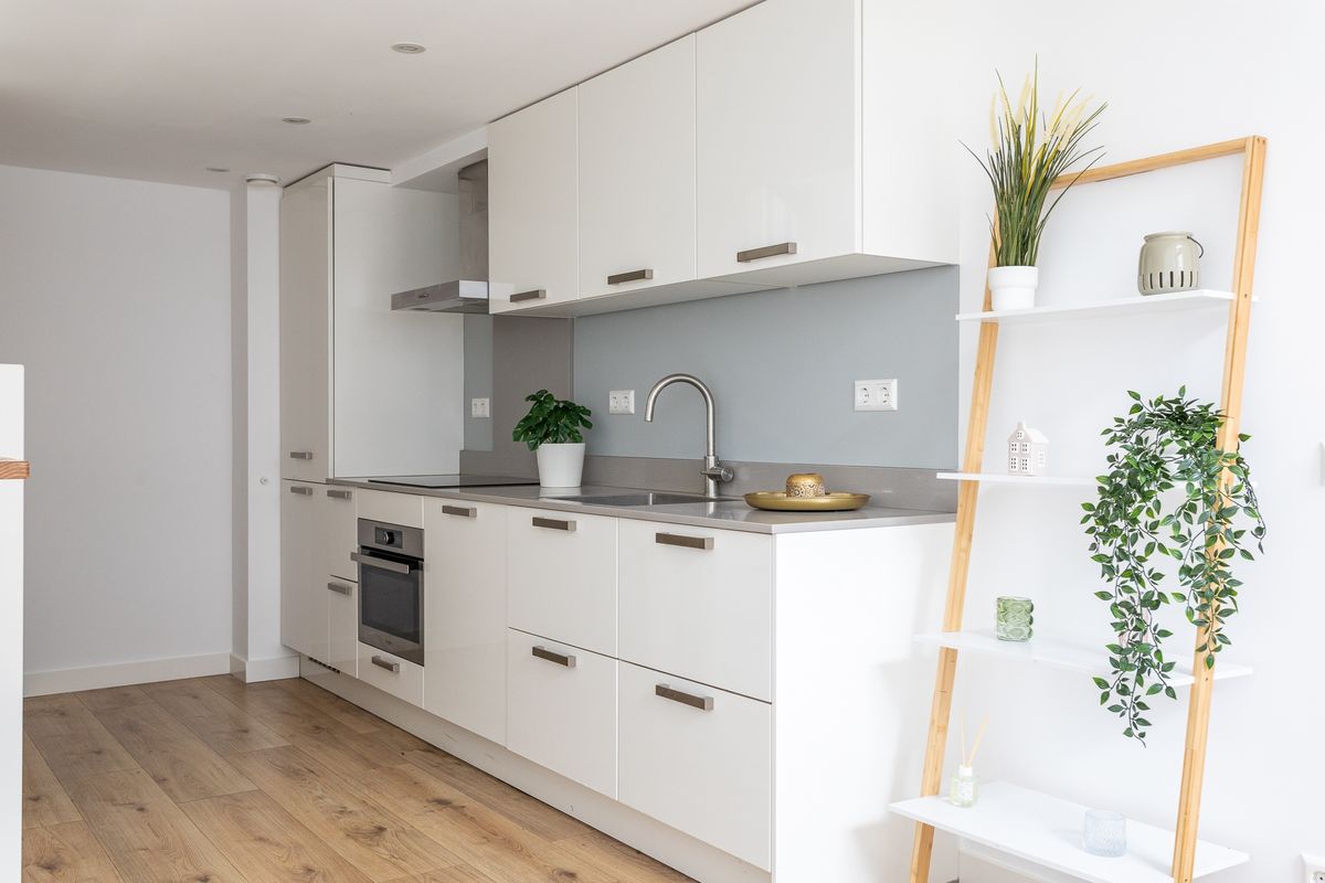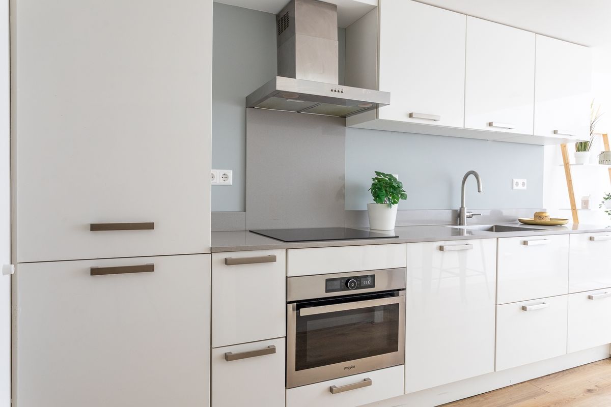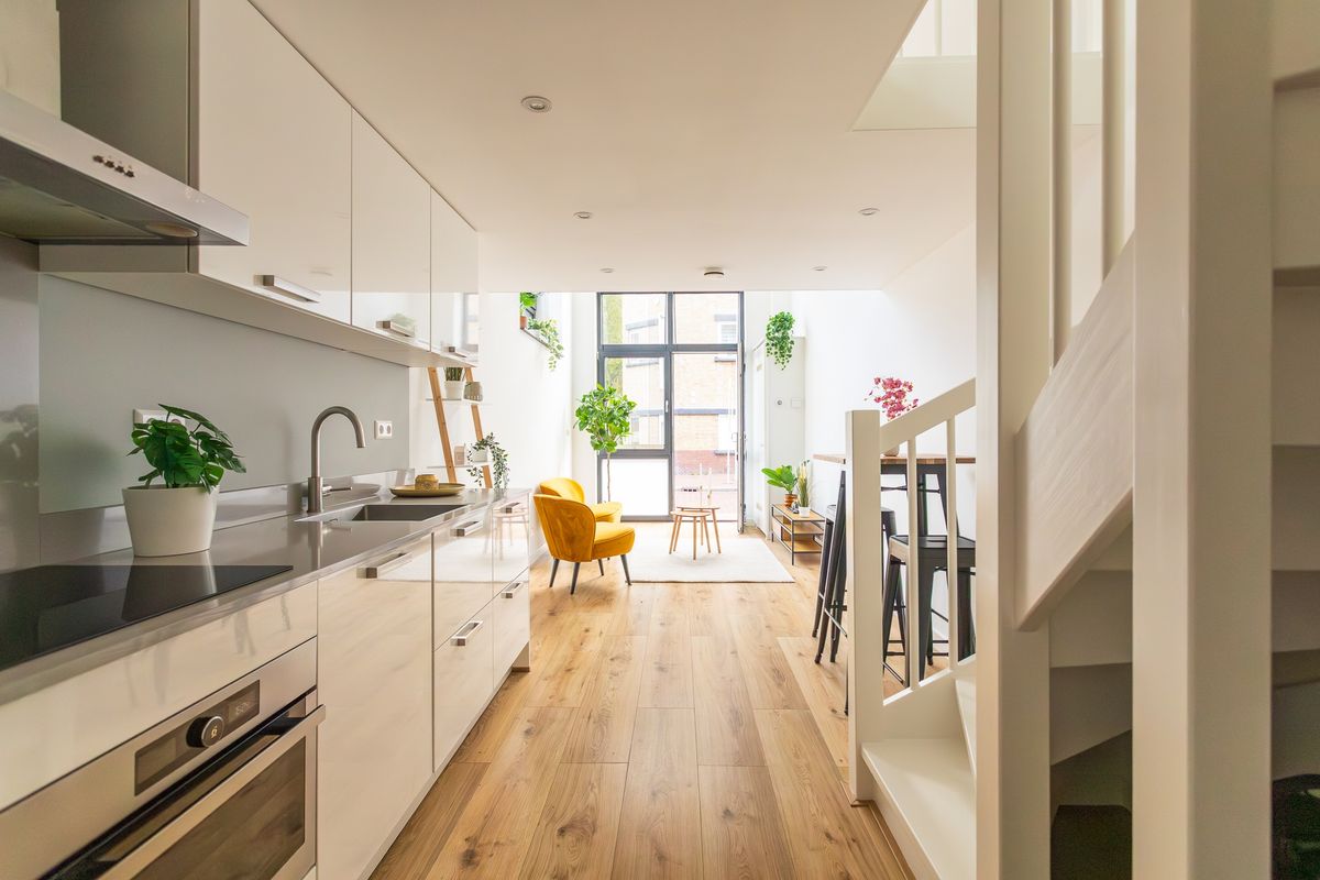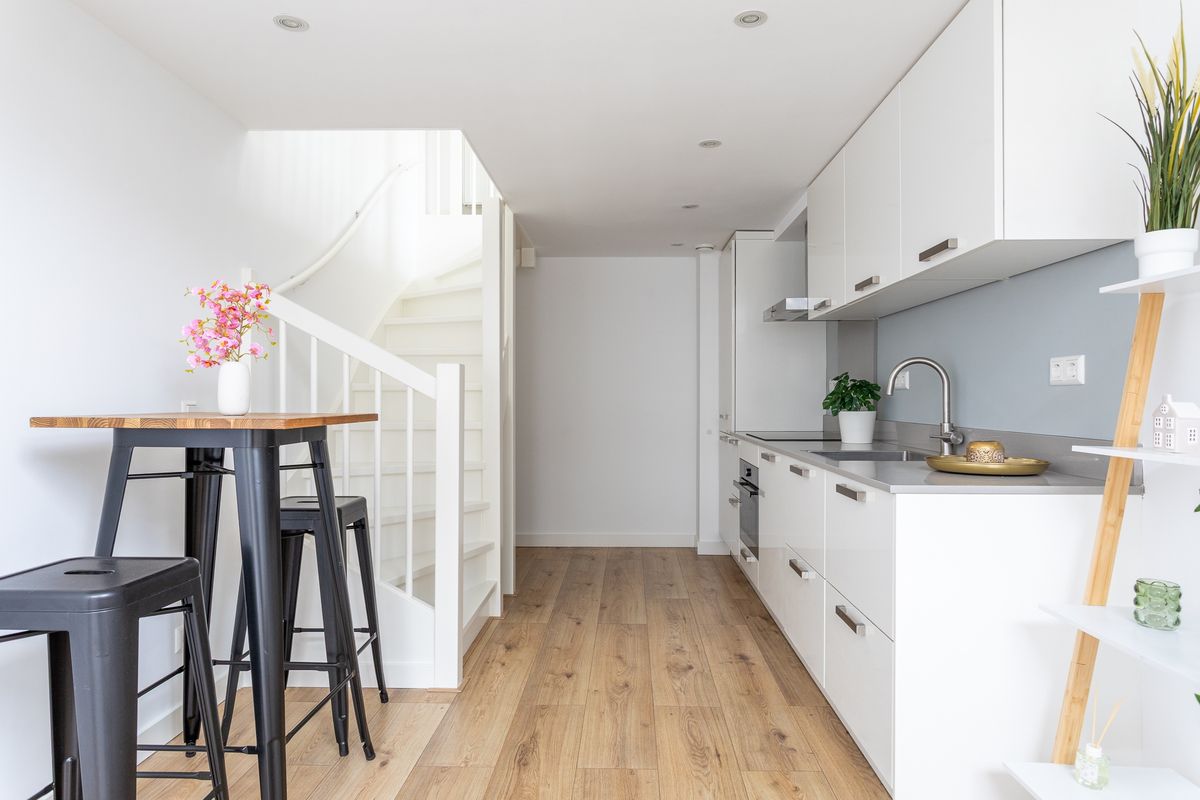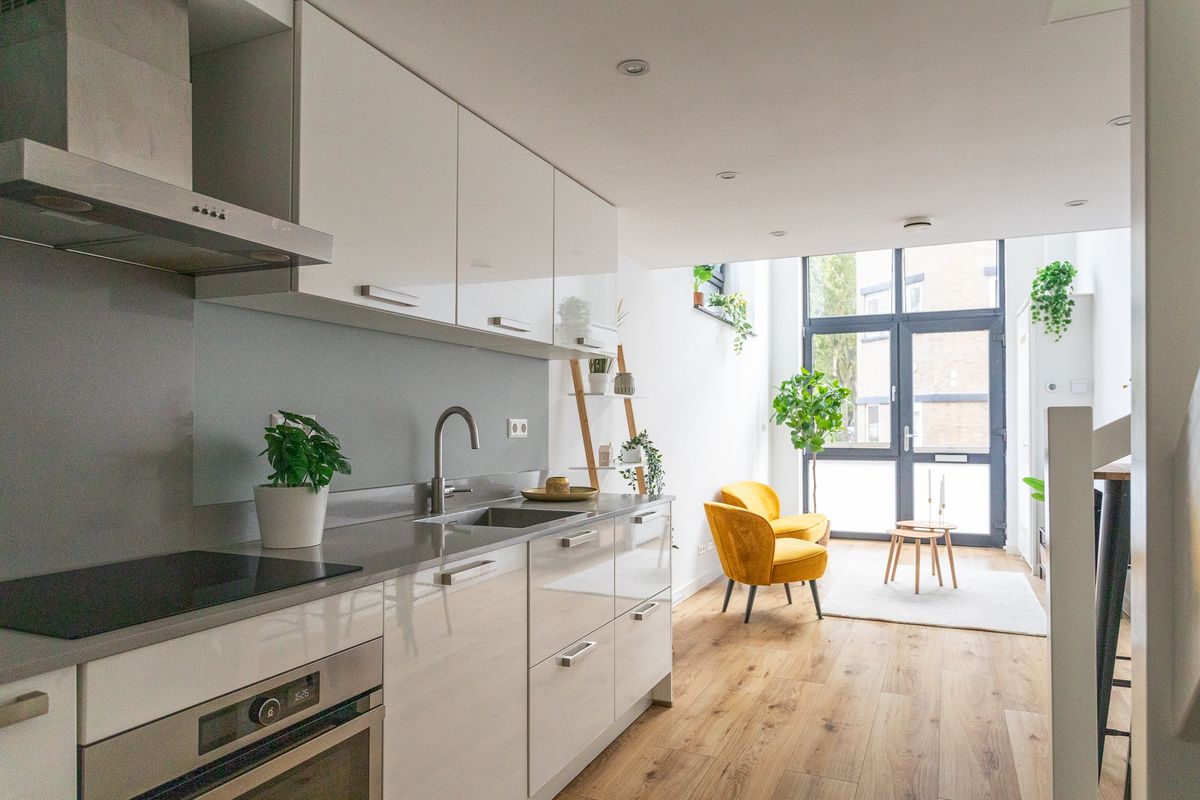 keukenblad met een mengkraan en vierkante spoelbak van Caressi. Naast de keuken is de trap naar de vide. Wanneer je de trap oploopt, kom je in de slaapkamer op de vide. Door de grote zijramen heeft de slaapkamer veel lichtinval en een mooi uitzicht over de Arnold Spoelplein en de omgeving. De slaapkamer heeft aan de