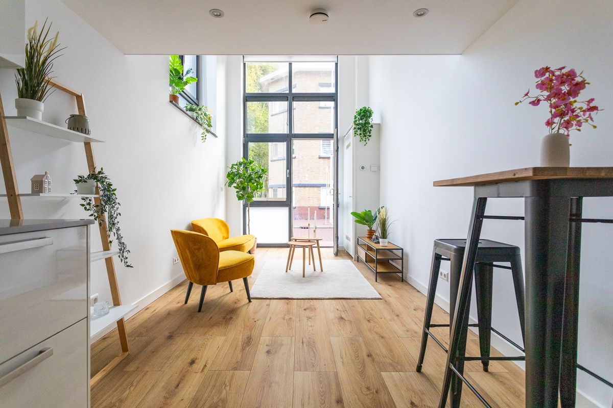 This trendy apartment is located on the ground floor at the corner of the apartment complex on Tramstraat and Arnold Spoelplein. The tall front façade and side windows provide plenty of natural light, while the impressive ceiling height (approx. 4.17 m) creates a spacious effect. From the front door, you step directly into the living room. On the left, you will find the utility cabinet with all utility meters and Cai (TV and internet) connections. The ground floor and the toilet/bathroom area (on the mezzanine) are fitted with underfloor heating. From the living room, you look into the apartment towards the mezzanine/bedroom and the kitchen.