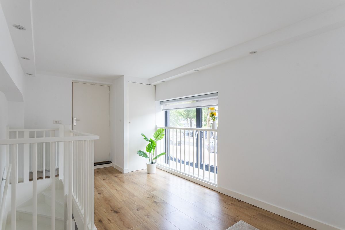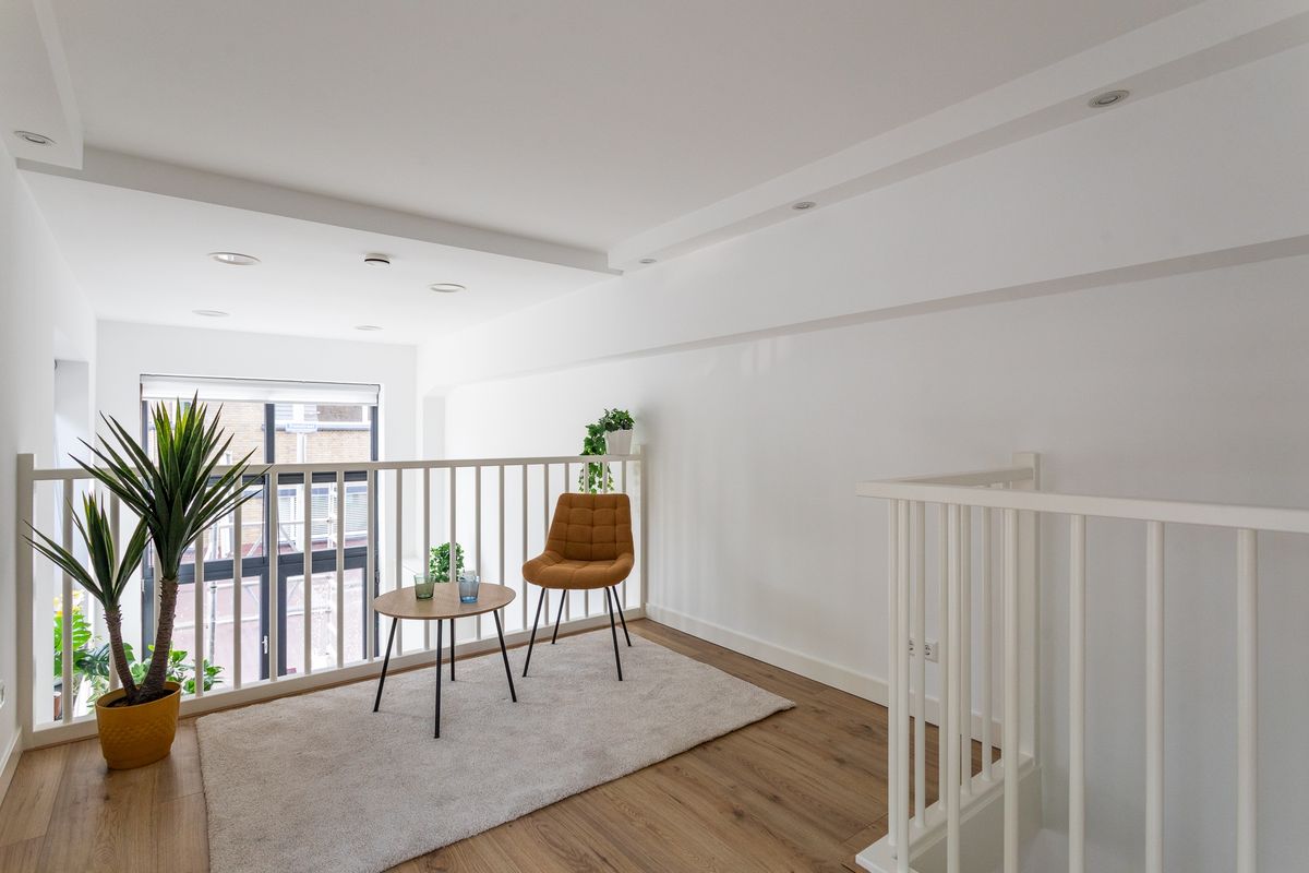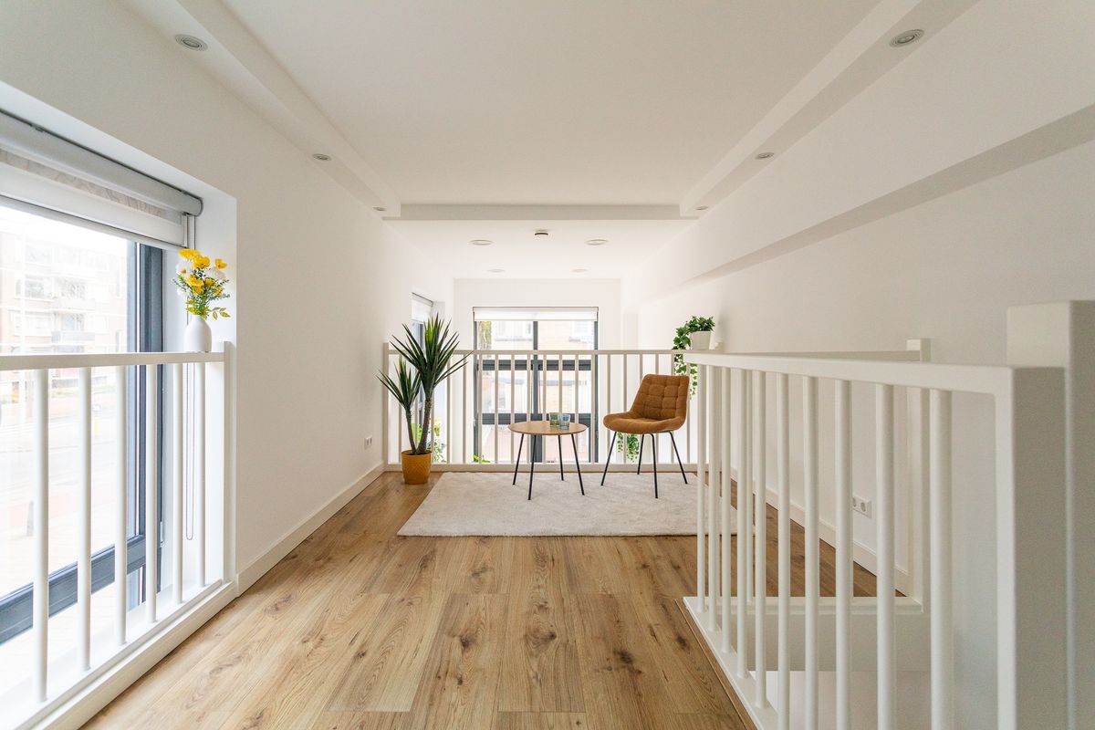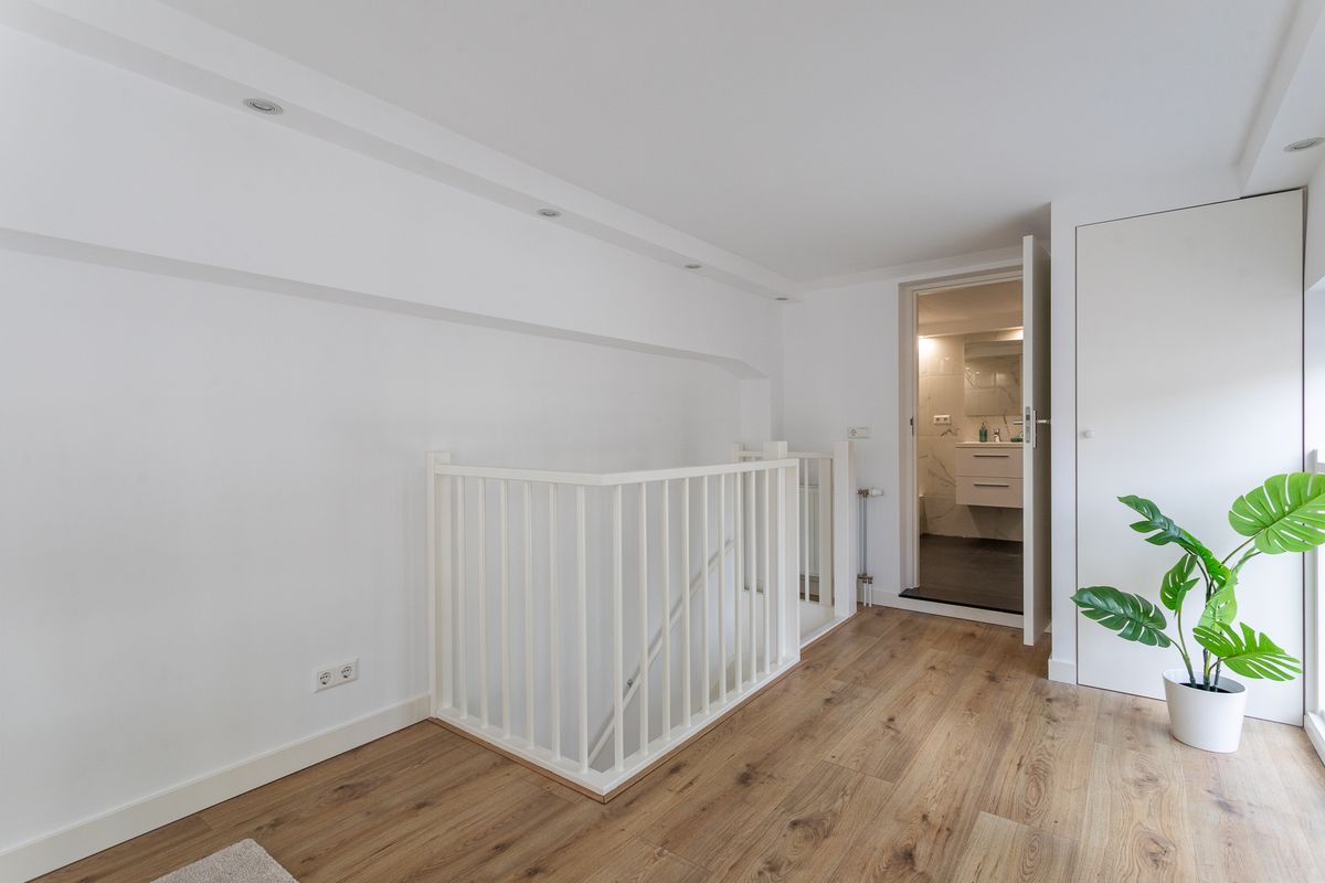 Upstairs, you reach the bedroom on the mezzanine. Thanks to the large side windows, the bedroom has plenty of daylight and a nice view over Arnold Spoelplein and the surroundings. The bedroom also features built-in LED spotlights on the sides of the ceiling for lighting and a small radiator. Next to the mezzanine is the spacious and luxurious bathroom. It is finished with high-quality tiling, a wall-hung toilet (with soft-close seat), a walk-in shower with built-in taps and drain, a rainfall shower integrated into the ceiling, a glass shower wall, a stylish vanity unit with washbasin, and a towel radiator. The bathroom also offers space for a washing machine and dryer.