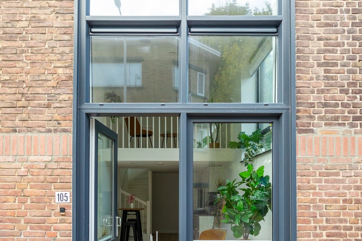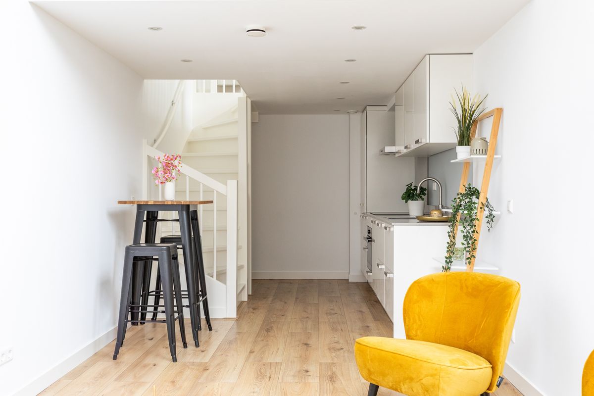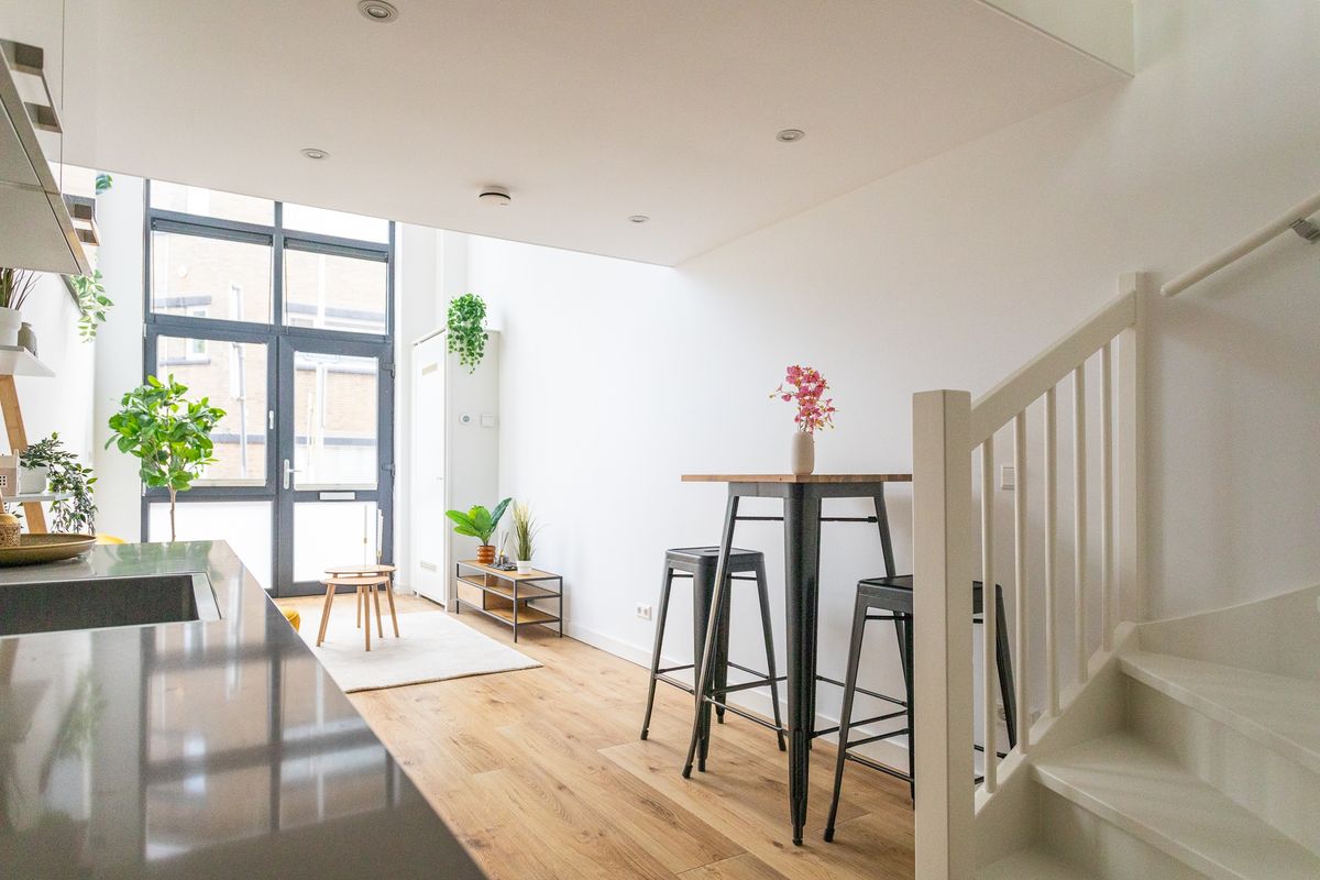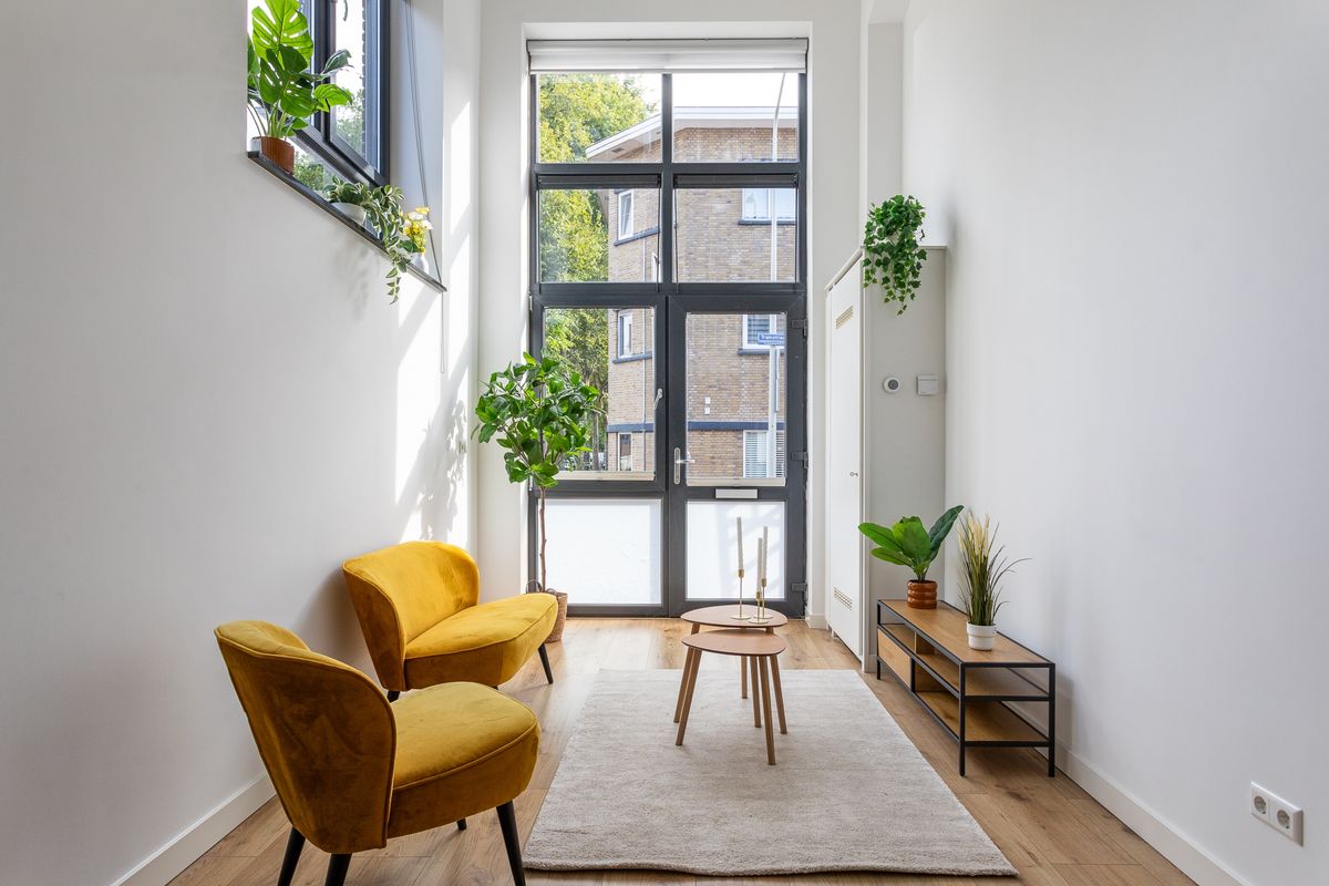 Upstairs, you reach the bedroom on the mezzanine. Thanks to the large side windows, the bedroom has plenty of daylight and a nice view over Arnold Spoelplein and the surroundings. The bedroom also features built-in LED spotlights on the sides of the ceiling for lighting and a small radiator. Next to the mezzanine is the spacious and luxurious bathroom. It is finished with high-quality tiling, a wall-hung toilet (with soft-close seat), a walk-in shower with built-in taps and drain, a rainfall shower integrated into the ceiling, a glass shower wall, a stylish vanity unit with washbasin, and a towel radiator. The bathroom also offers space for a washing machine and dryer.