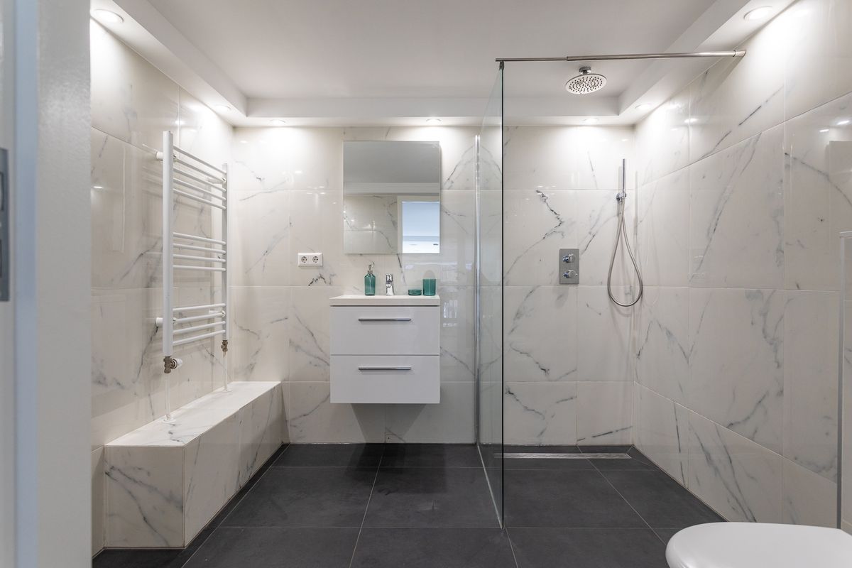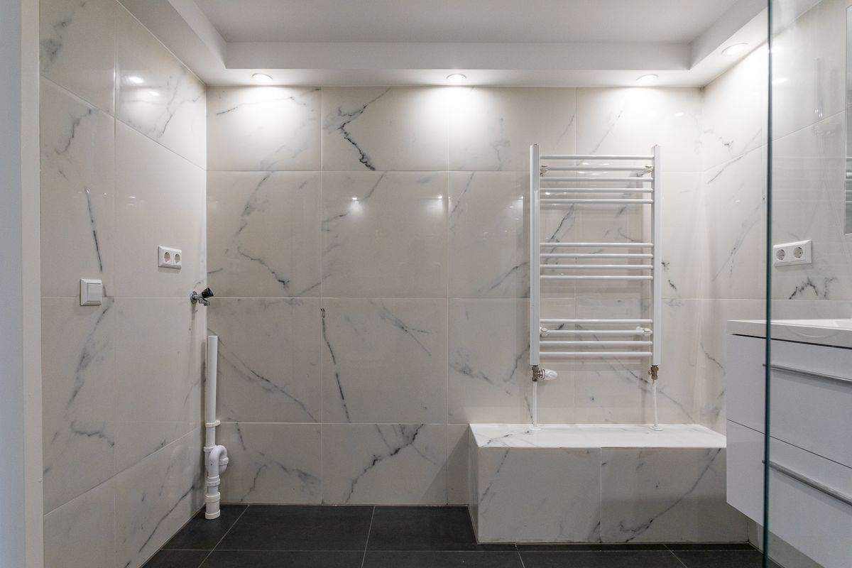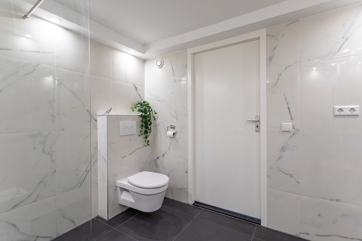 zijkanten van het plafond inbouw-led-spotjes om de ruimte te verlichten. De ruimte is ook voorzien van een kleine radiator. Naast de vide heb je de ruime en luxe badkamer. De badkamer is voorzien van hoogwaardig tegelwerk, zwevend wandtoilet (met softclose zitting), inloopdouche met inbouwkranen en drain, en een regendouche met de aansluiting in het plafond verwerkt, een glazen douchewand en een luxe badkamermeubel met wastafel en een handdoekradiator. In de