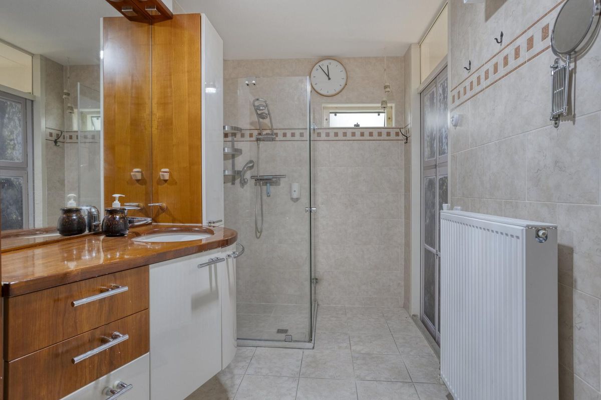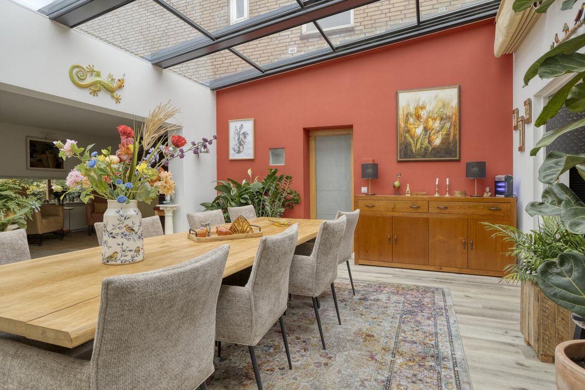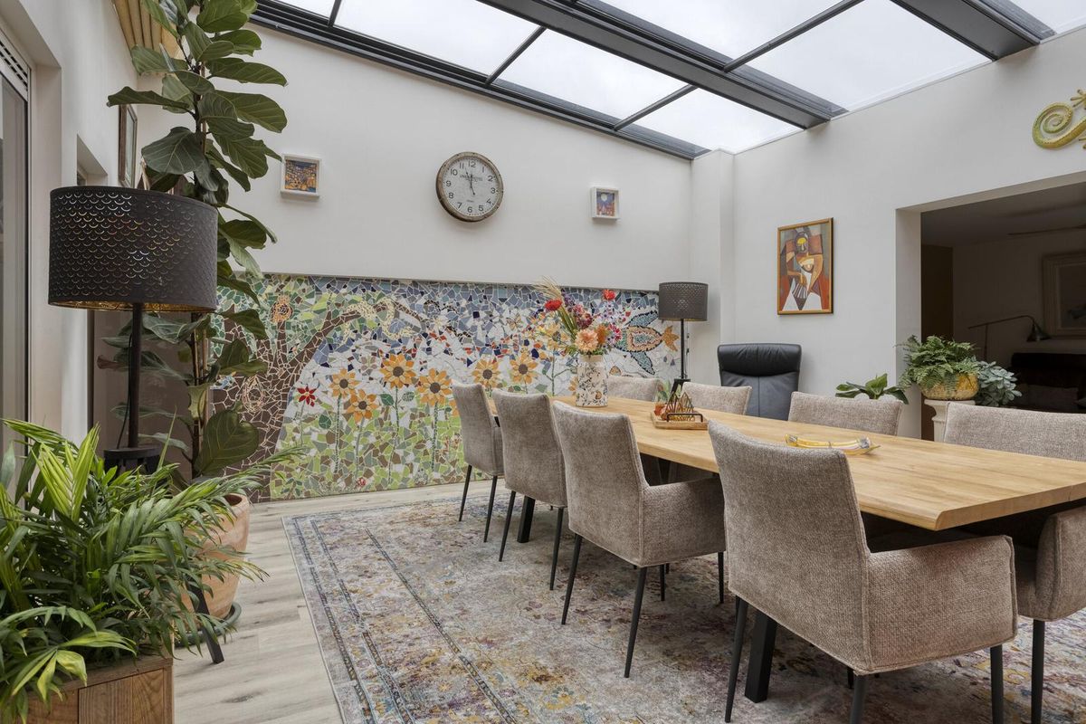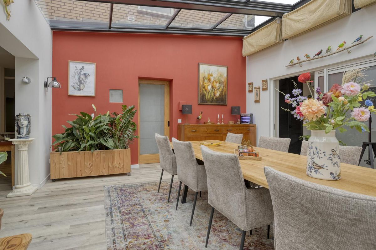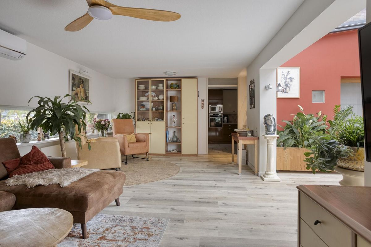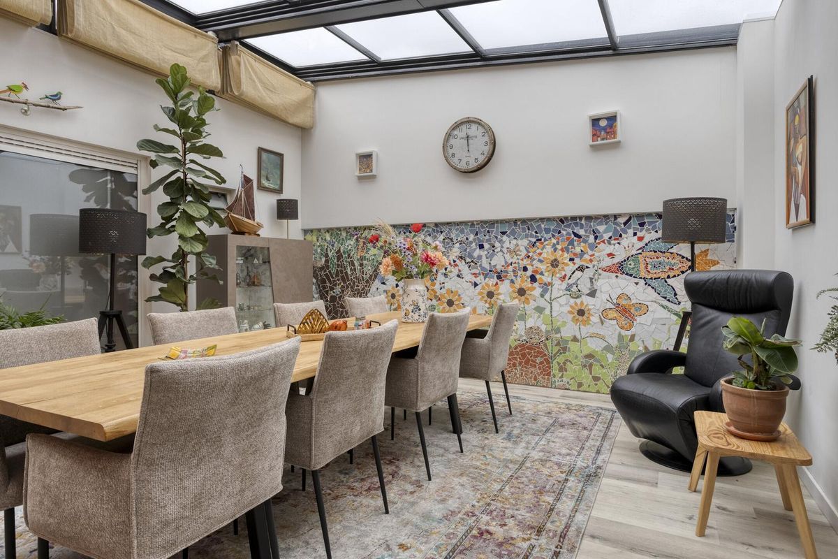In het hart van het huis vinden we de sfeervolle eetkamer/atrium (voorheen patio), een heerlijke plek met ruimte voor een grote eettafel (8 personen) en bijvoorbeeld een servieskast. Dankzij het glazen dak valt hier prachtig daglicht binnen, hier wordt elke maaltijd een moment om van te genieten. Aansluitend loop je door naar het zitgedeelte, compleet met airco, ruimte voor een fijne zithoek en extra fauteuils. De gesloten keuken in U-opstelling biedt volop kastruimte en werkblad, en is uitgerust met een kookplaat, afzuigkap, magnetron, combi-oven, vaatwasser én plek voor een knusse ontbijttafel. Via de keuken heb je direct toegang tot de tuin. Op deze verdieping vind je ook een praktische bijkeuken, voorzien van aansluitingen voor de wasmachine en droger. Vanuit deze ruimte heb je toegang tot een extra kamer die zich perfect leent als thuiswerkplek, hobbyruimte of bijvoorbeeld een rustige studeerkamer. Daarnaast is er nog een extra berging, zowel van binnenuit als via de buitenzijde bereikbaar, ideaal voor het stallen van fietsen, seizoensspullen of andere opslag. Deze slimme indeling maakt het huis niet alleen comfortabel, maar ook verrassend functioneel.
