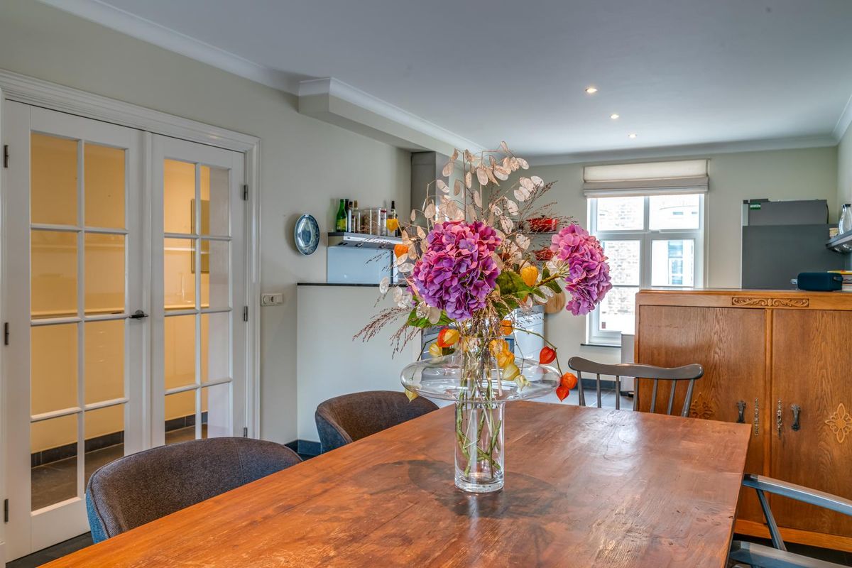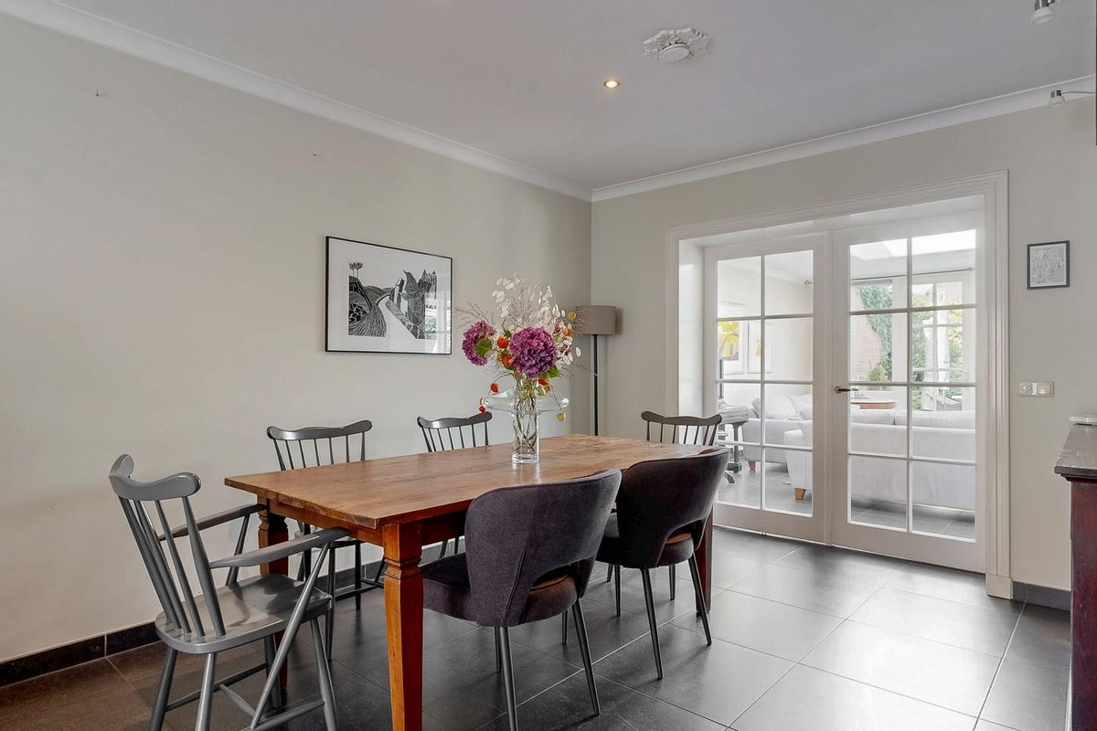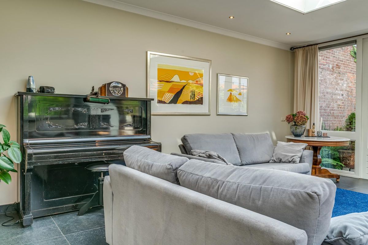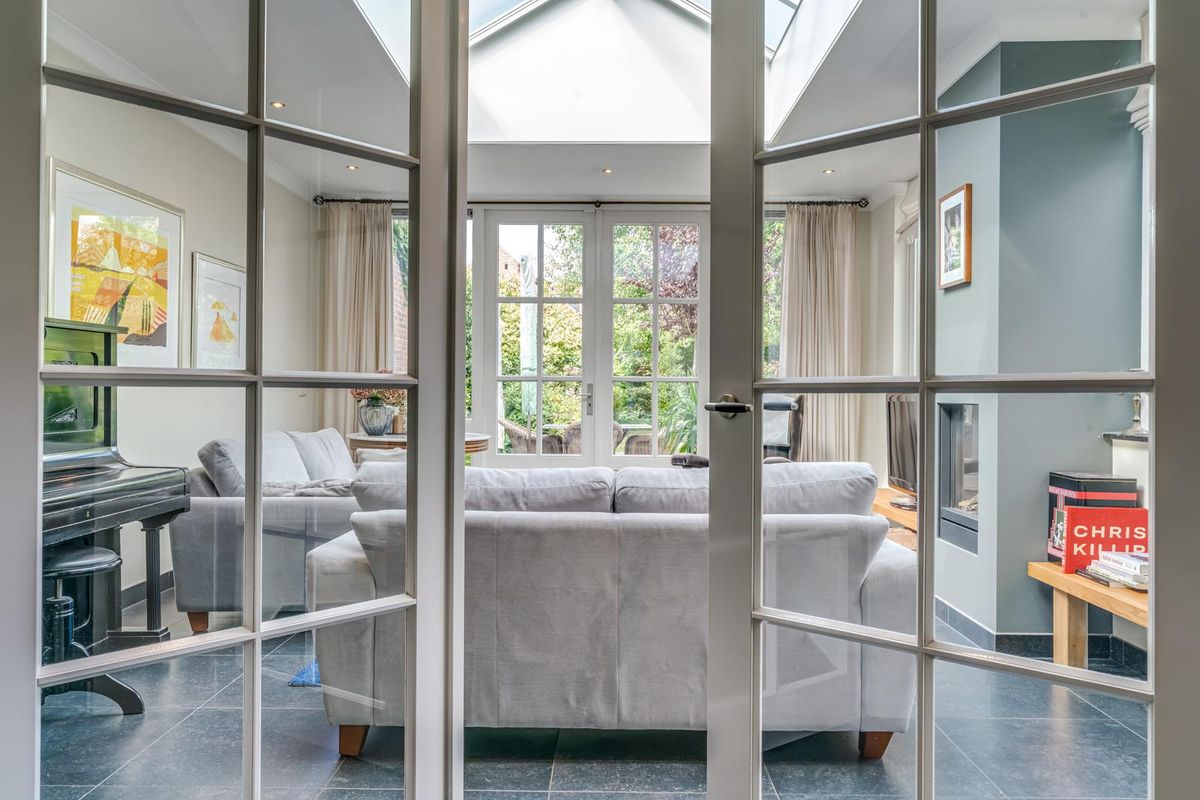In de leefkeuken is er tevens voldoende ruimte voor een grote eettafel met stoelen. Via dubbele glasdeuren is de aangrenzende woonkamer bereikbaar. Tegen de achterzijde van de oorspronkelijke woning is de woonkamer in 2006 gesitueerd.
