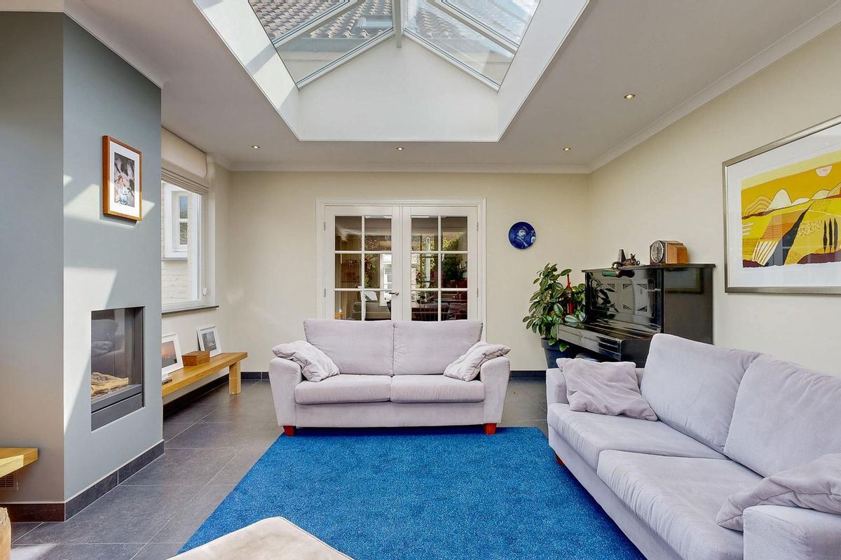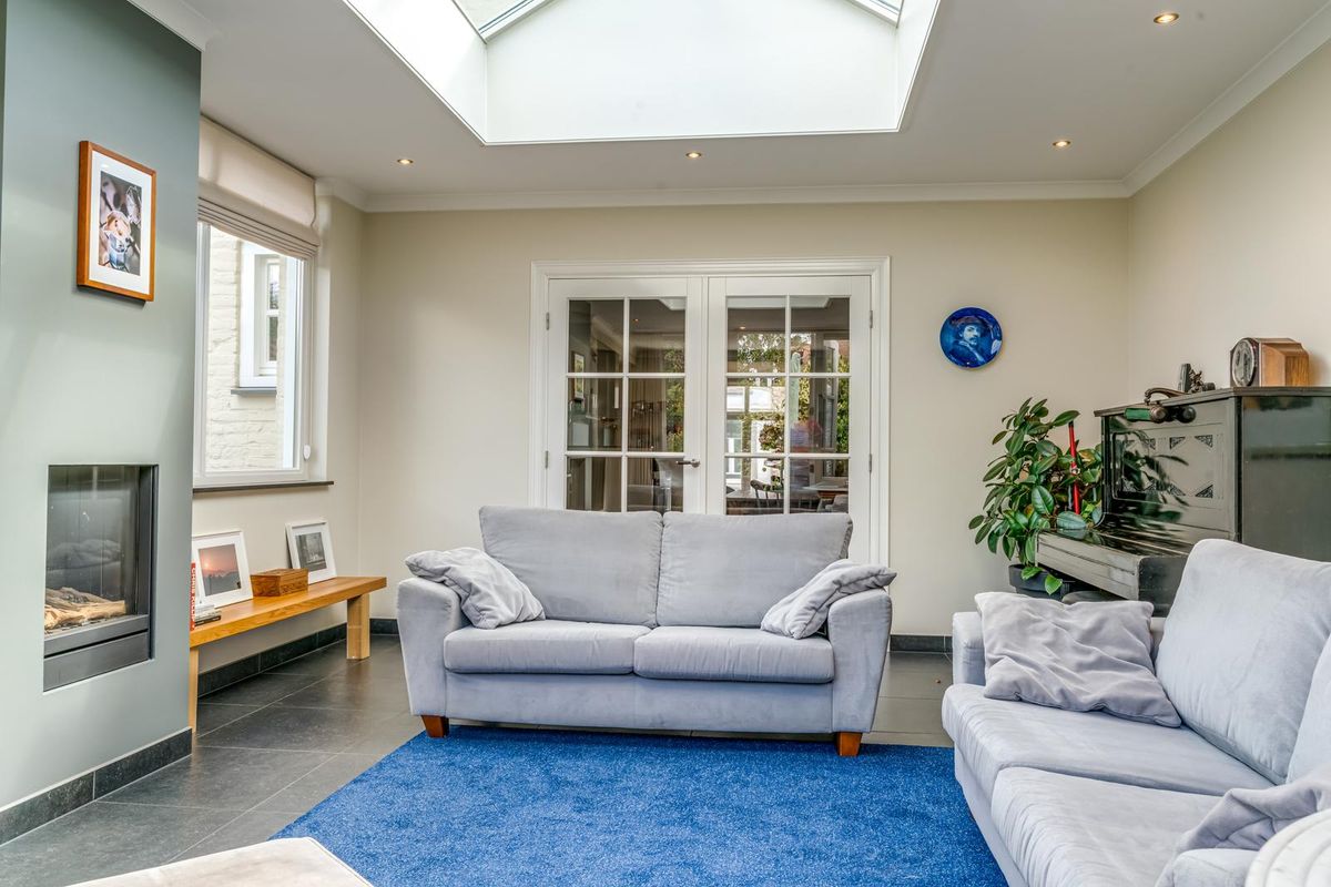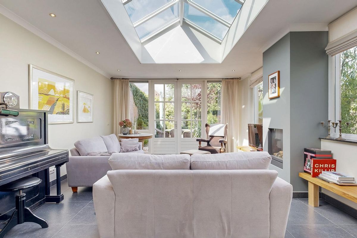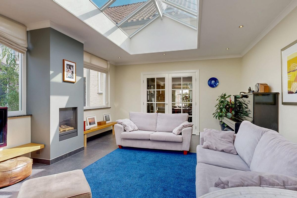 De woonkamer is heerlijk licht door de diverse raampartijen en de grote lichtstraat in het plafond. De moderne gashaard biedt extra warmte en sfeer aan het geheel. Via dubbele glasdeuren is de achtertuin bereikbaar. U geniet daardoor van optimaal tuincontact.